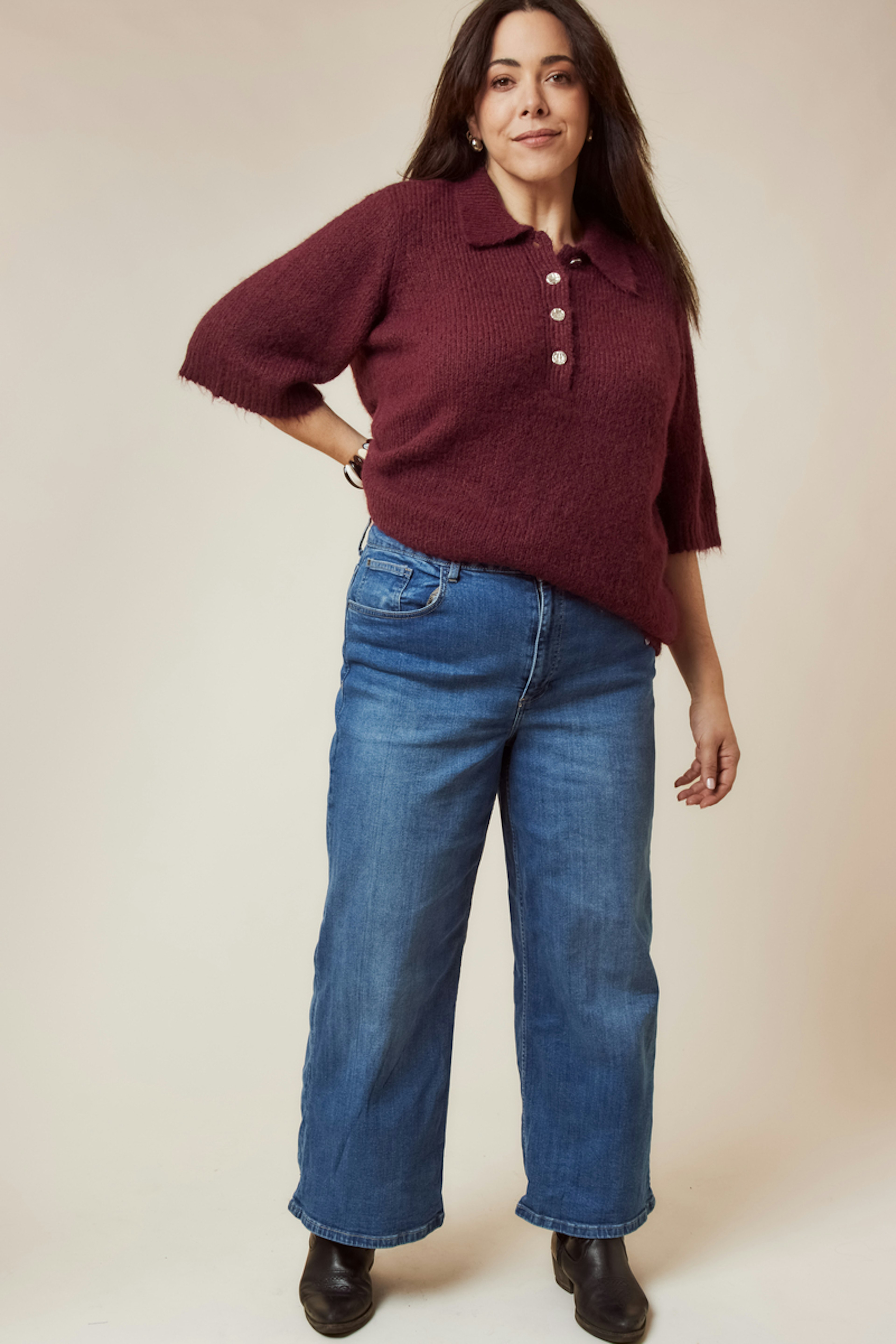 Portez ce haut avec un pantalon en laine et des bottines pour un look chic d'hiver. • Polo en tricot • Col chemise • Manches mi-longues • Boutonnage sur le devant • Texture gaufrée