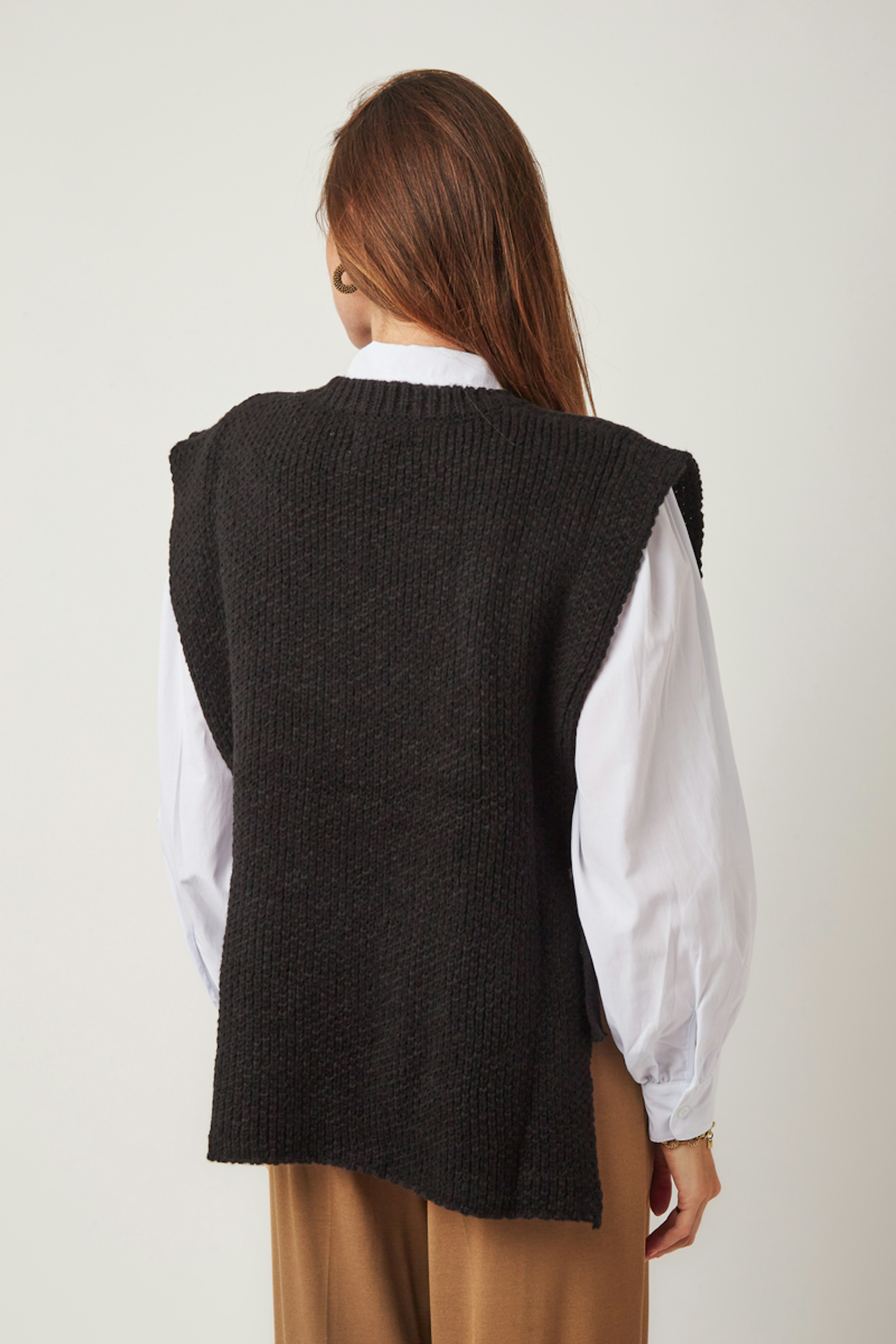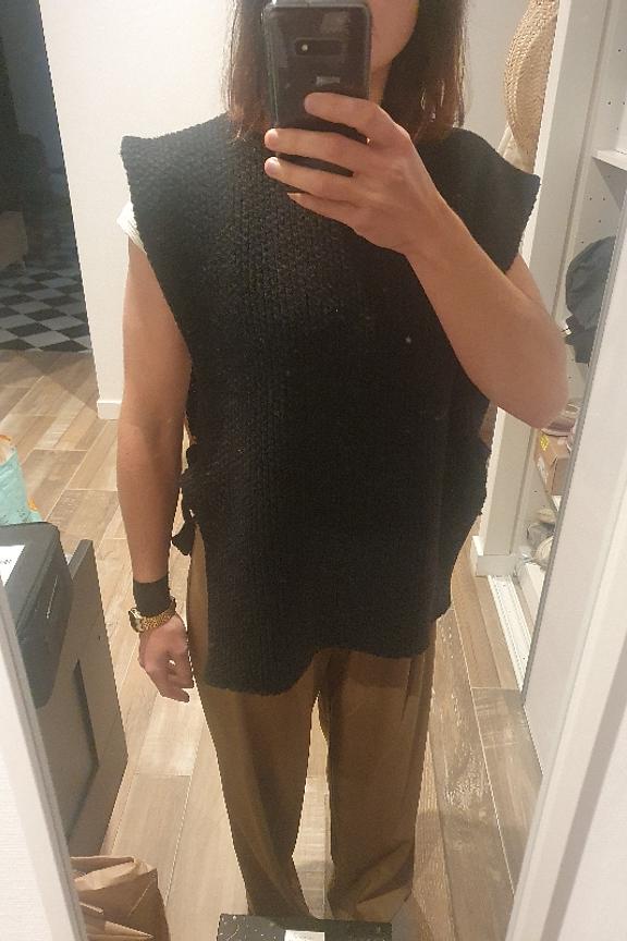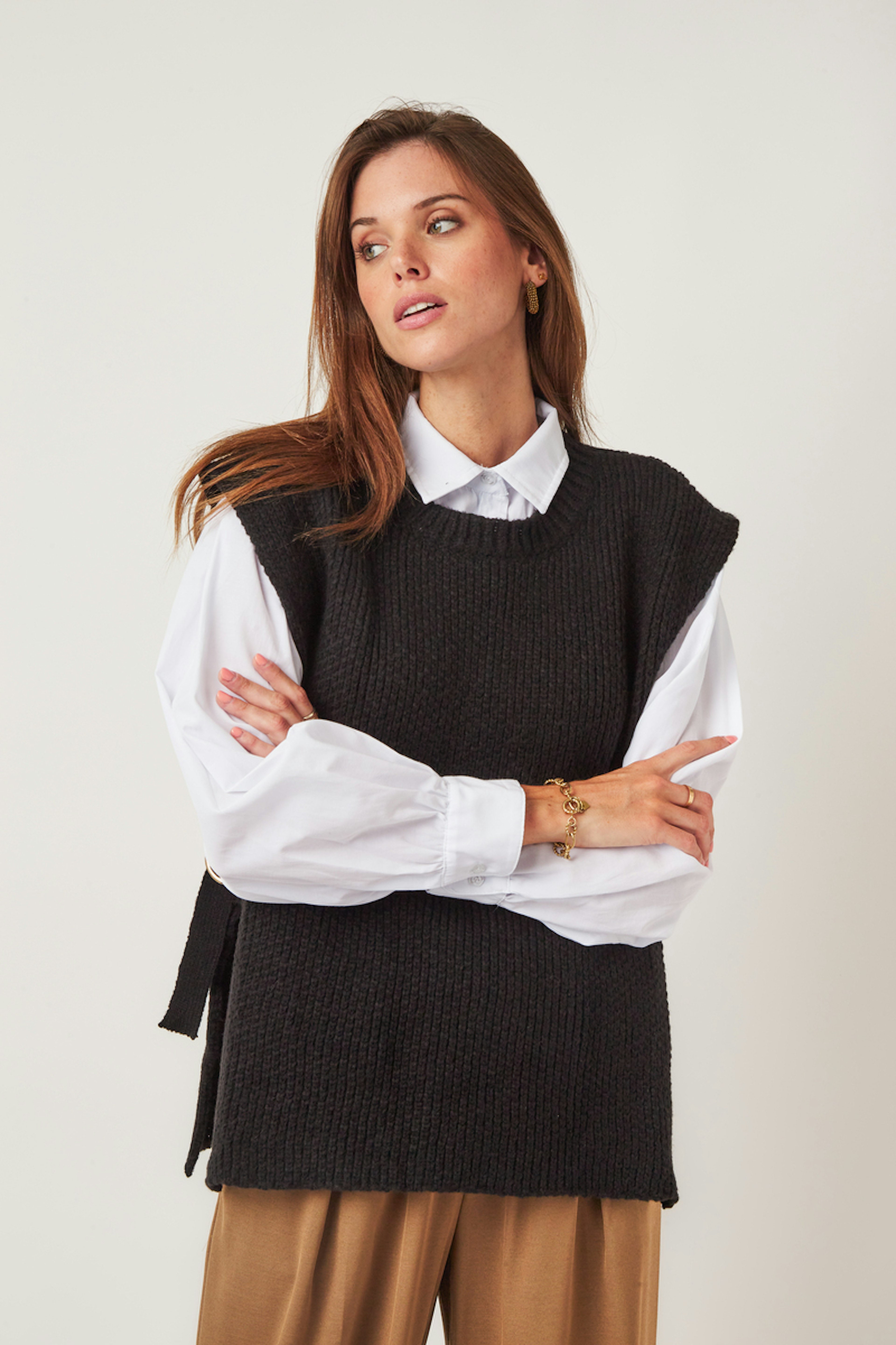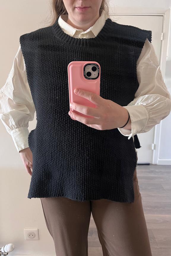 โข Taille unique qui convient du 34 au 42 โข Pull sans manche noir, idรฉal en superposition sur une chemise blanche ! โข Col rond โข Ouverture sur le cotรฉ โข Coupe ample โข Bandes sur les cรดtรฉs pour un ajustement parfait
