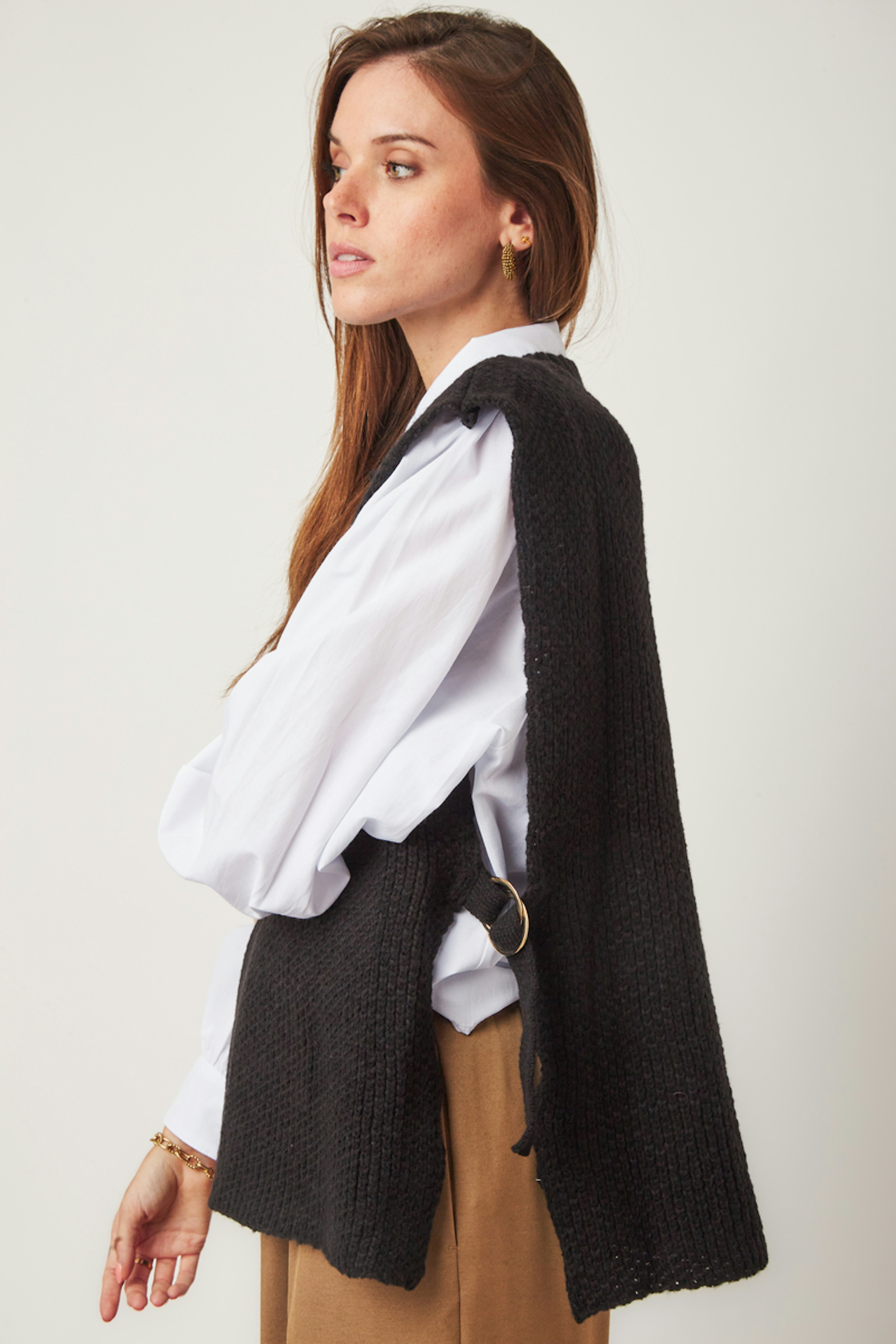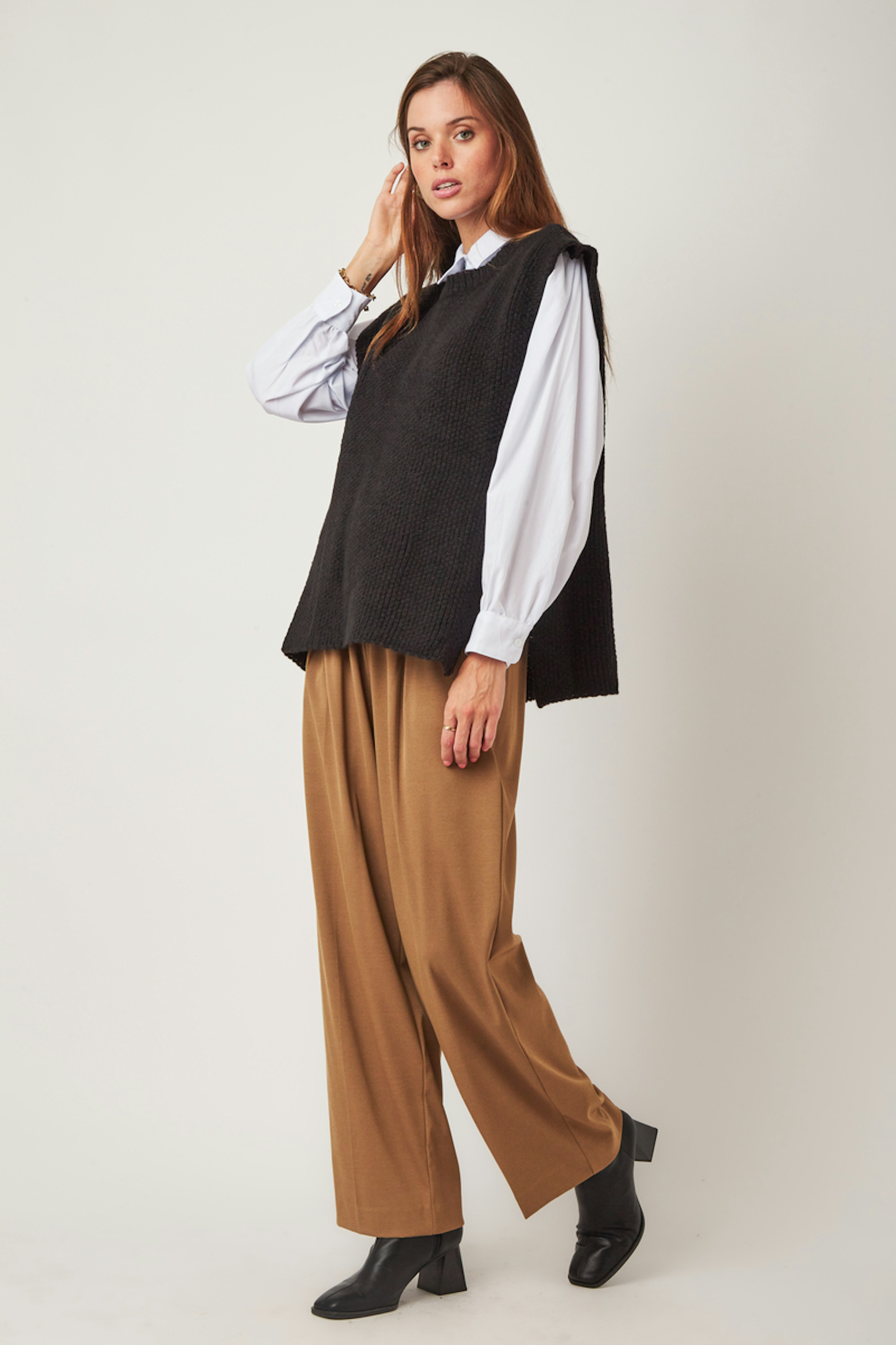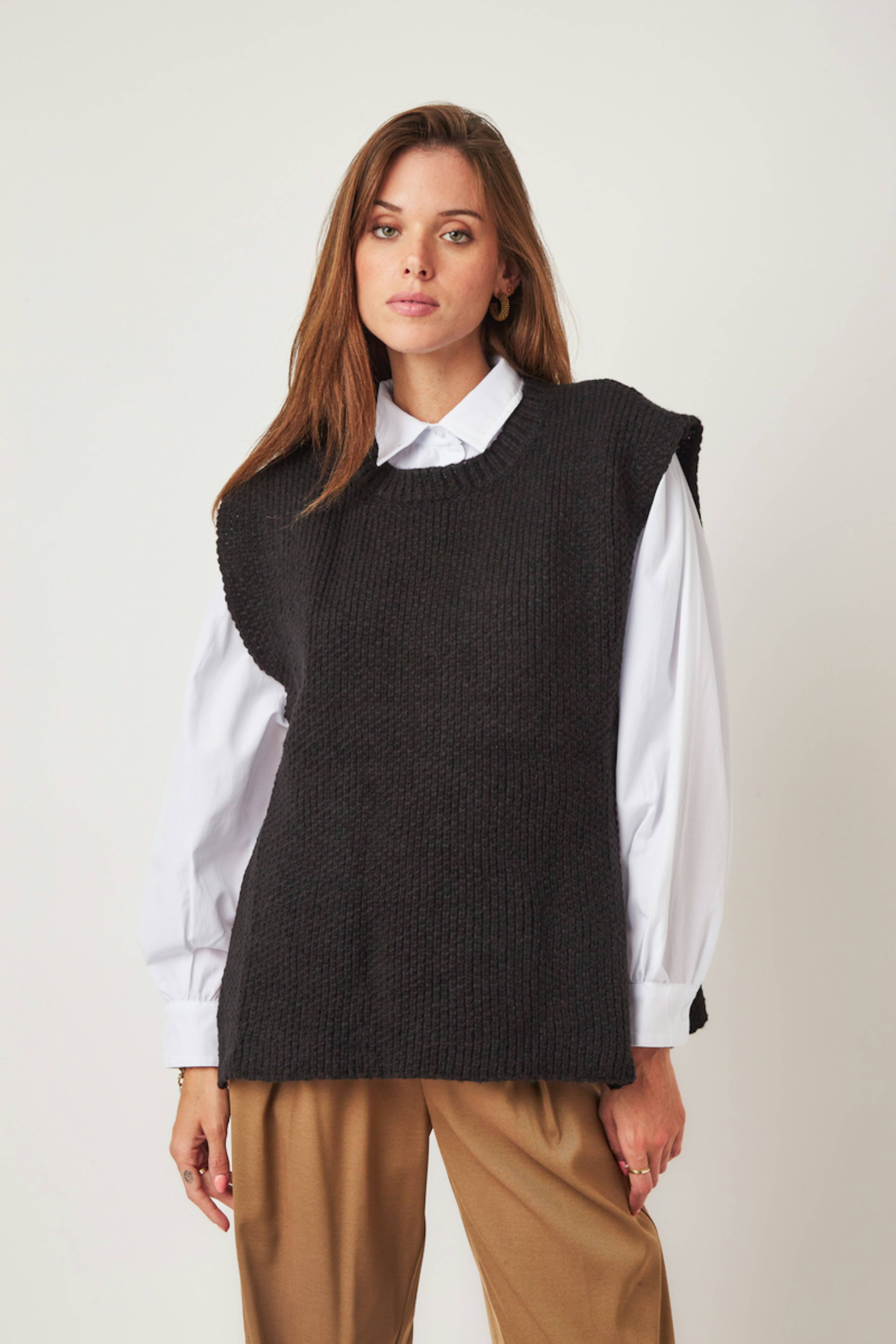 โข Taille unique qui convient du 34 au 42 โข Pull sans manche noir, idรฉal en superposition sur une chemise blanche ! โข Col rond โข Ouverture sur le cotรฉ โข Coupe ample โข Bandes sur les cรดtรฉs pour un ajustement parfait