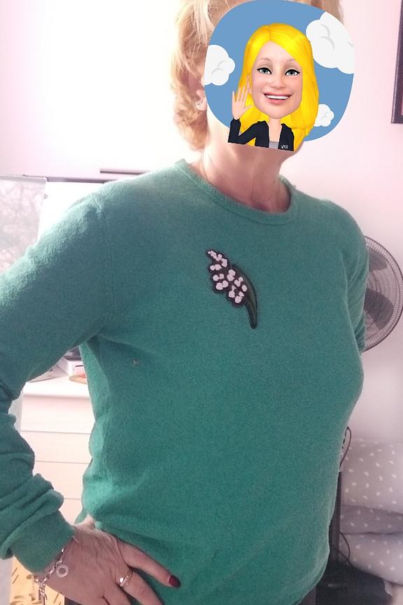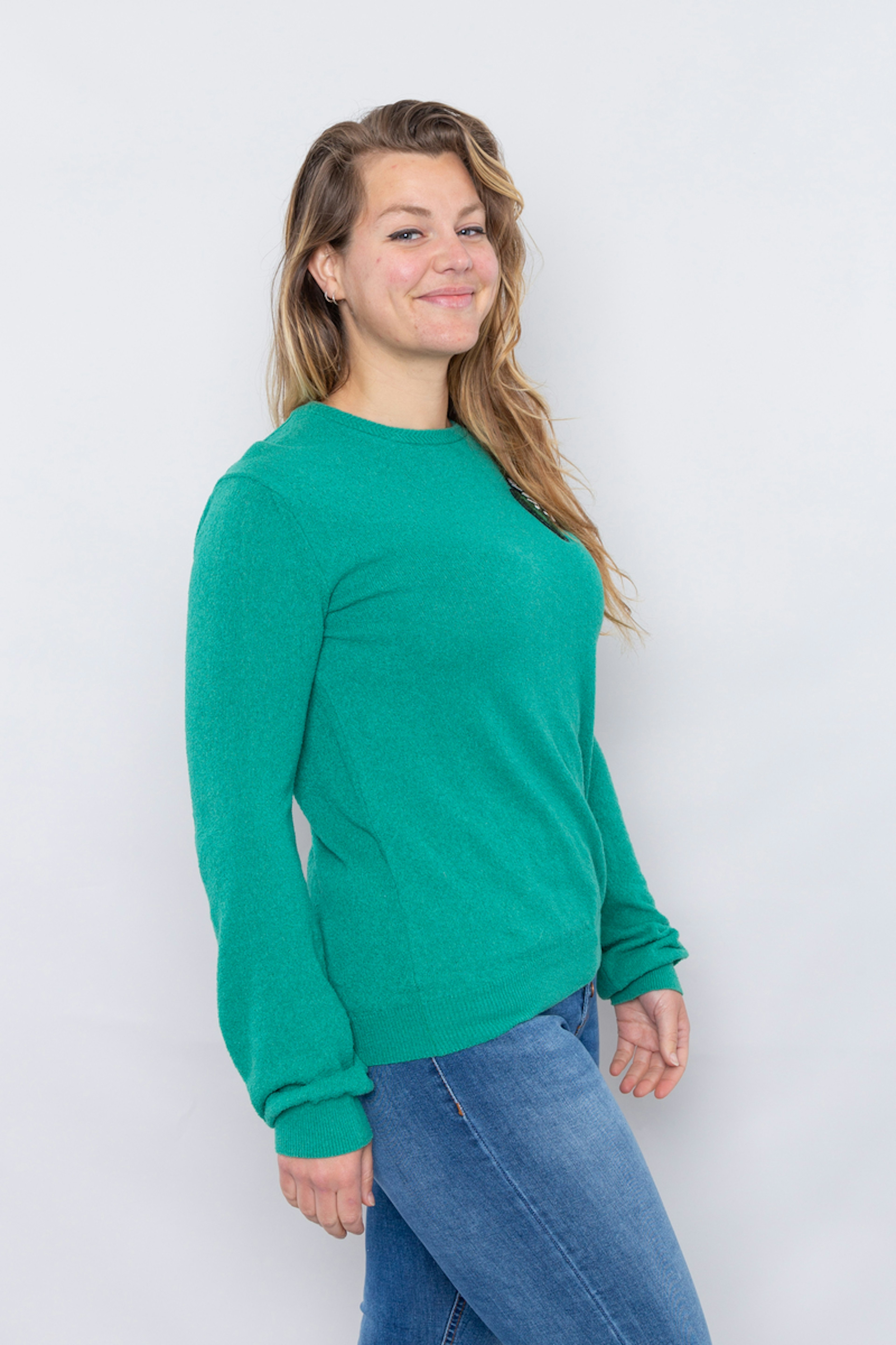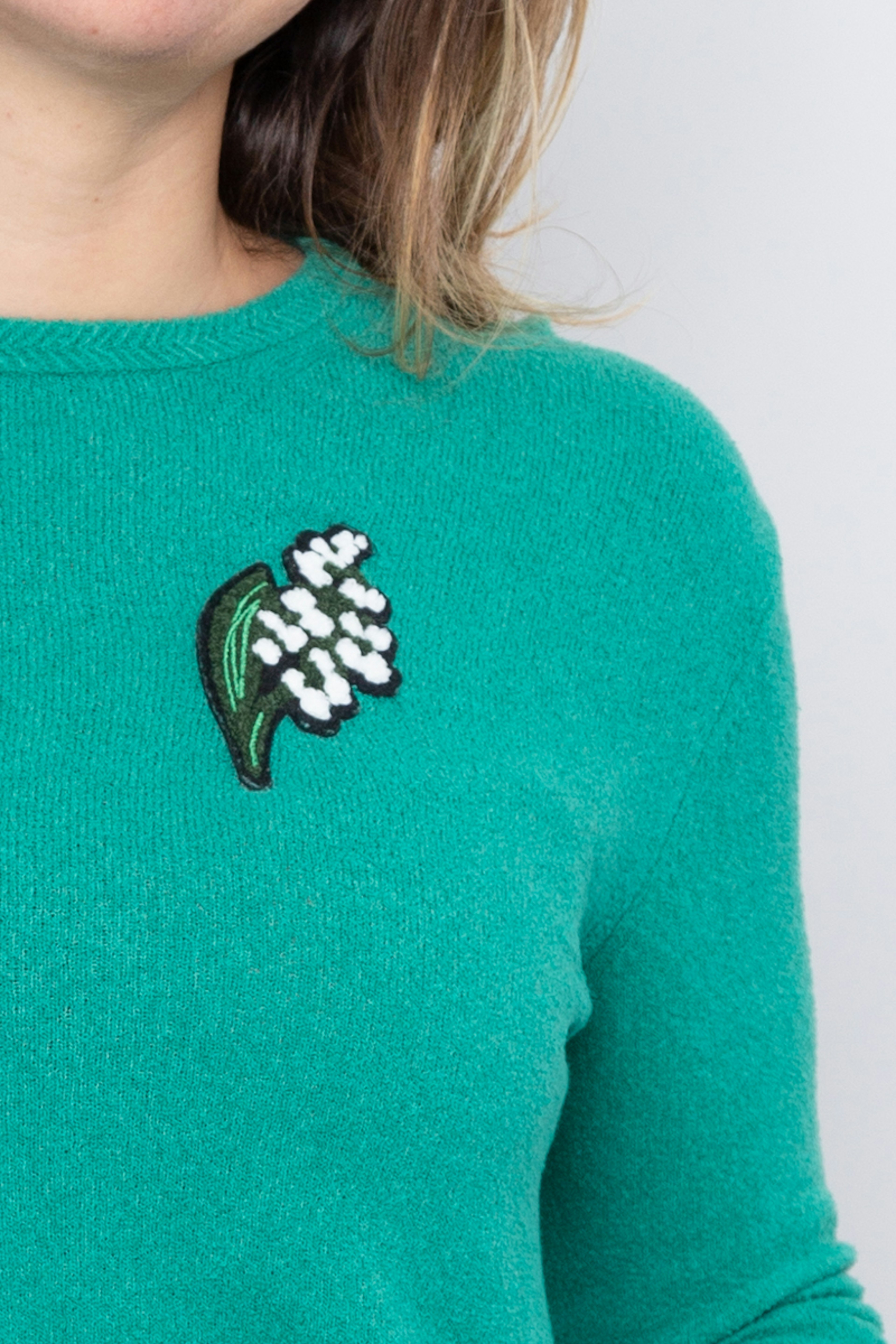 โ€ข Pull en maille bouclette verte โ€ข Encolure ronde travaillรฉe โ€ข Patch motif "Muguet"