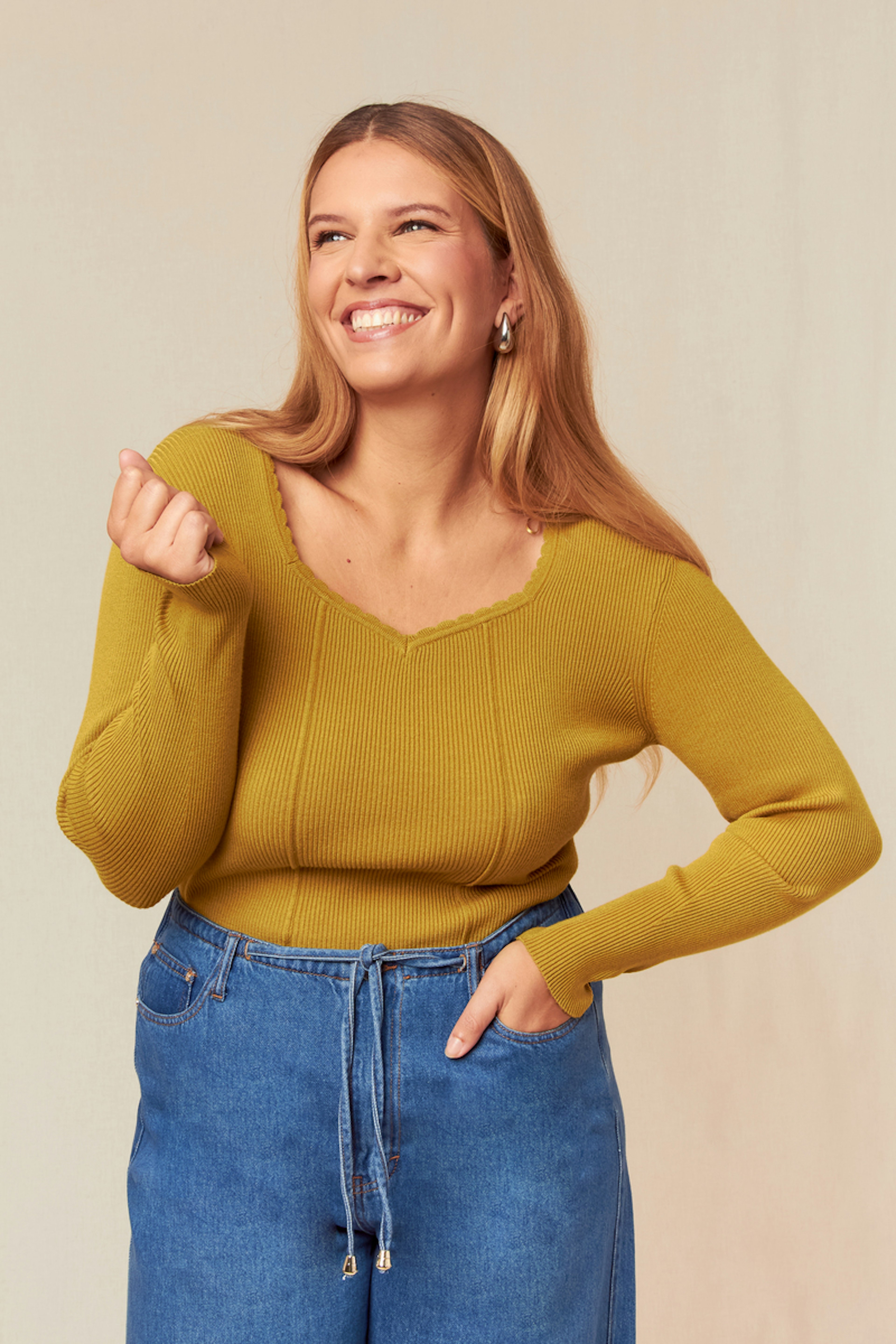 Associez ce magnifique pull avec un pantalon noir ajusté et des bottines pour un look d'hiver chic et décontracté. • Pull en laine côtelée • Col carré élégant • Manches longues • Coupe ajustée flatteuse • Détail coutures apparentes