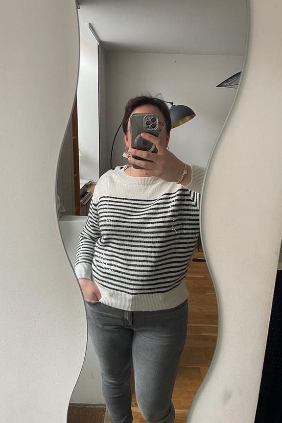 โข Convient du 34 au 42. โข Pull rayรฉ faรงon mariniรจre avec sequins blanc โข Trois boutons fantaisies sur รฉpaule de gauche โข Col rond โข Emmanchures basses โข Finitions bords-cรดtes