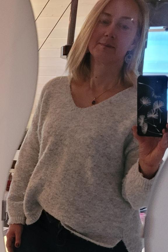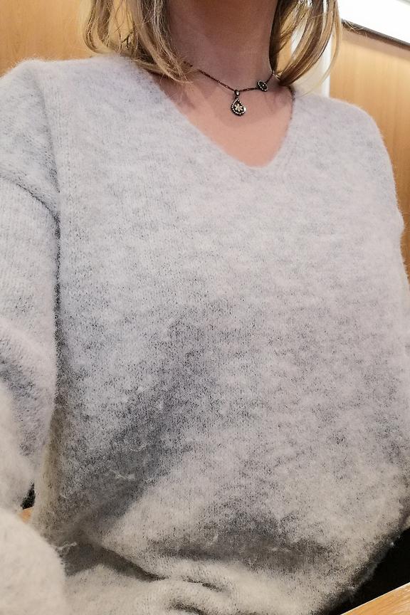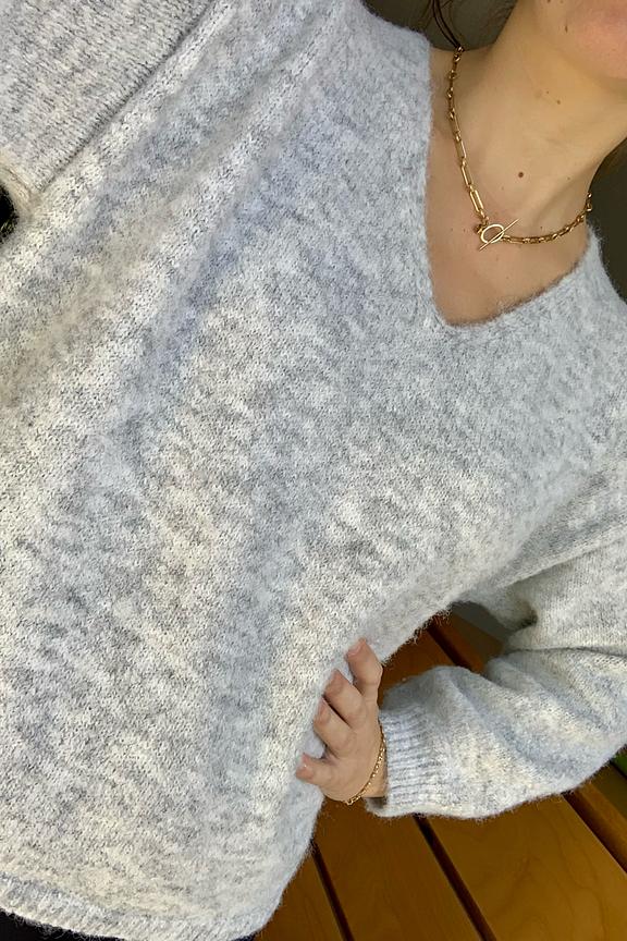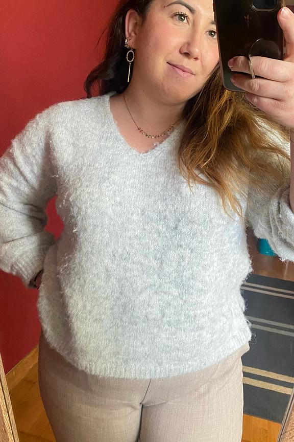 โข Pull-over moyenne gauge, composรฉ de 59% de polyester recyclรฉ. โข Encolure V โข Manches longues et bord-cรดtes en finition โข Coupe fรฉminine