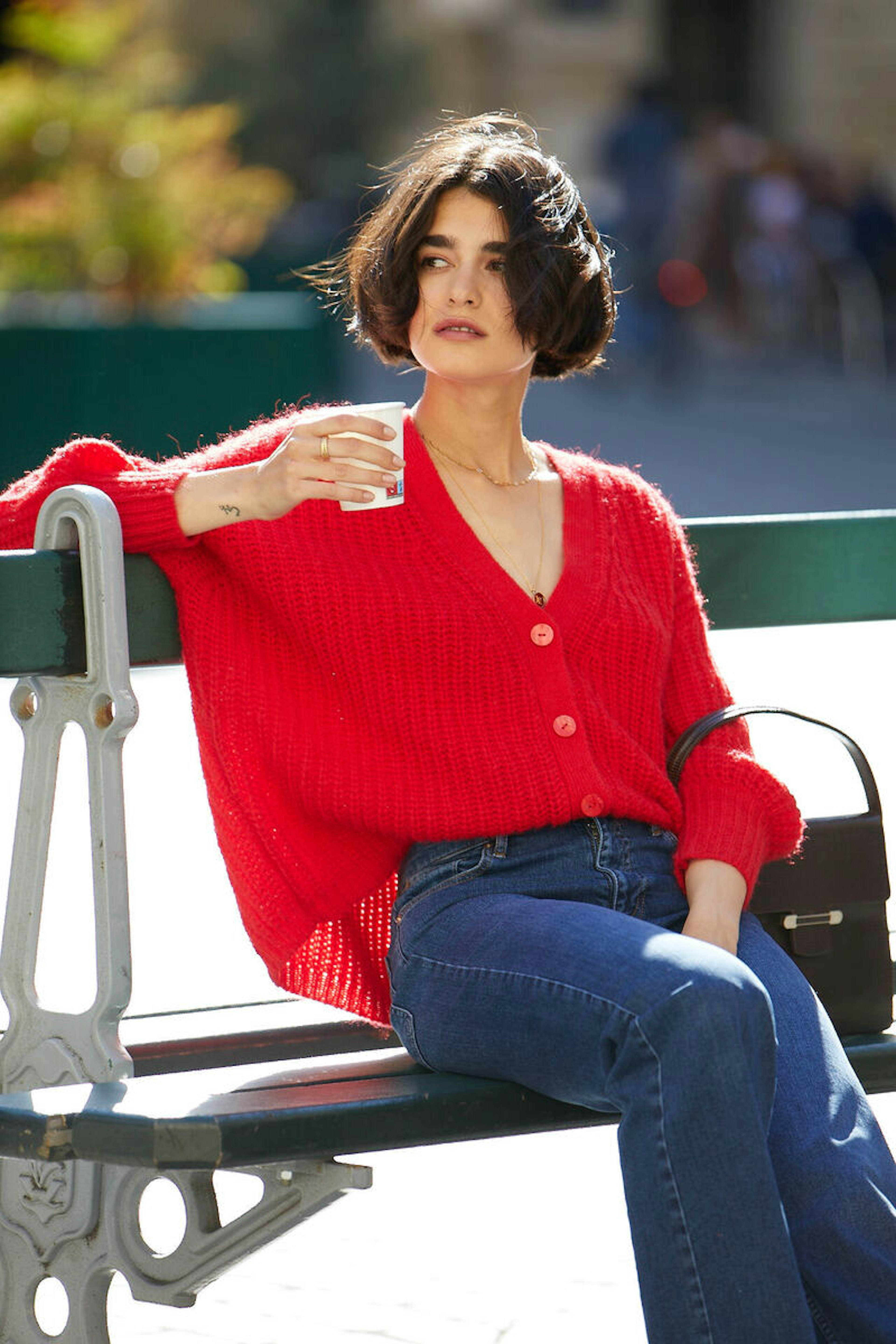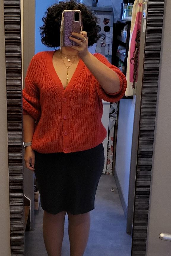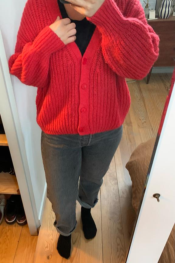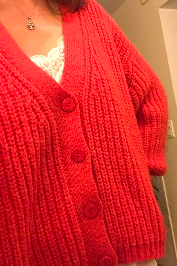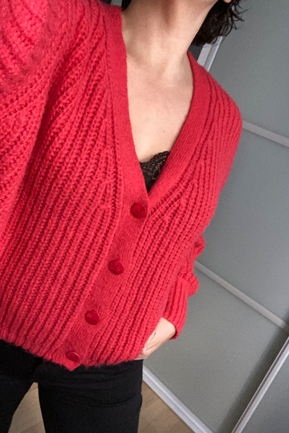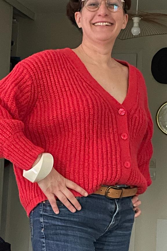 โGilet assez court, couleur moins rouge que sur la photo. Maille ร grosses cรดtes, assez lourd et pas trรจs doux.โ