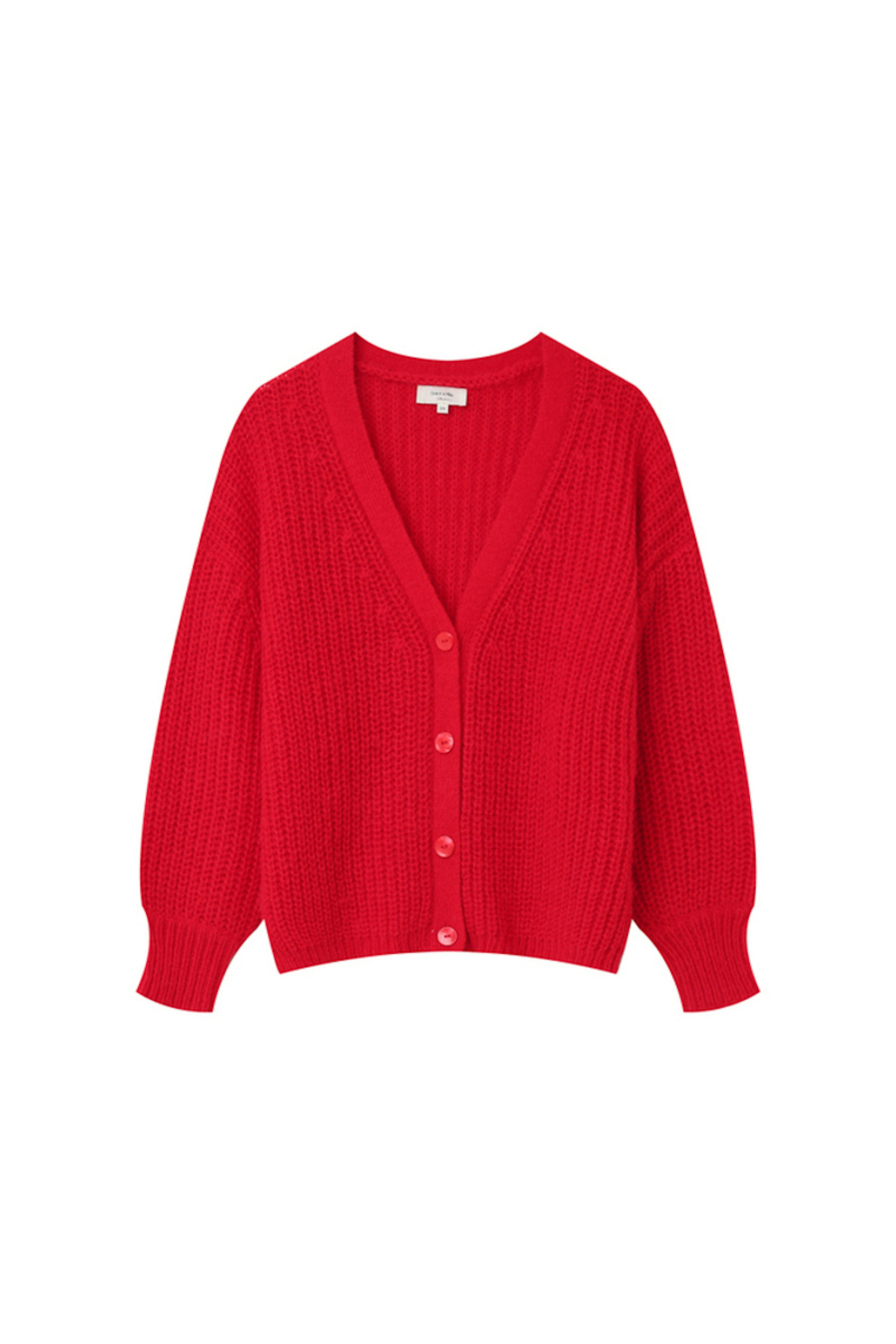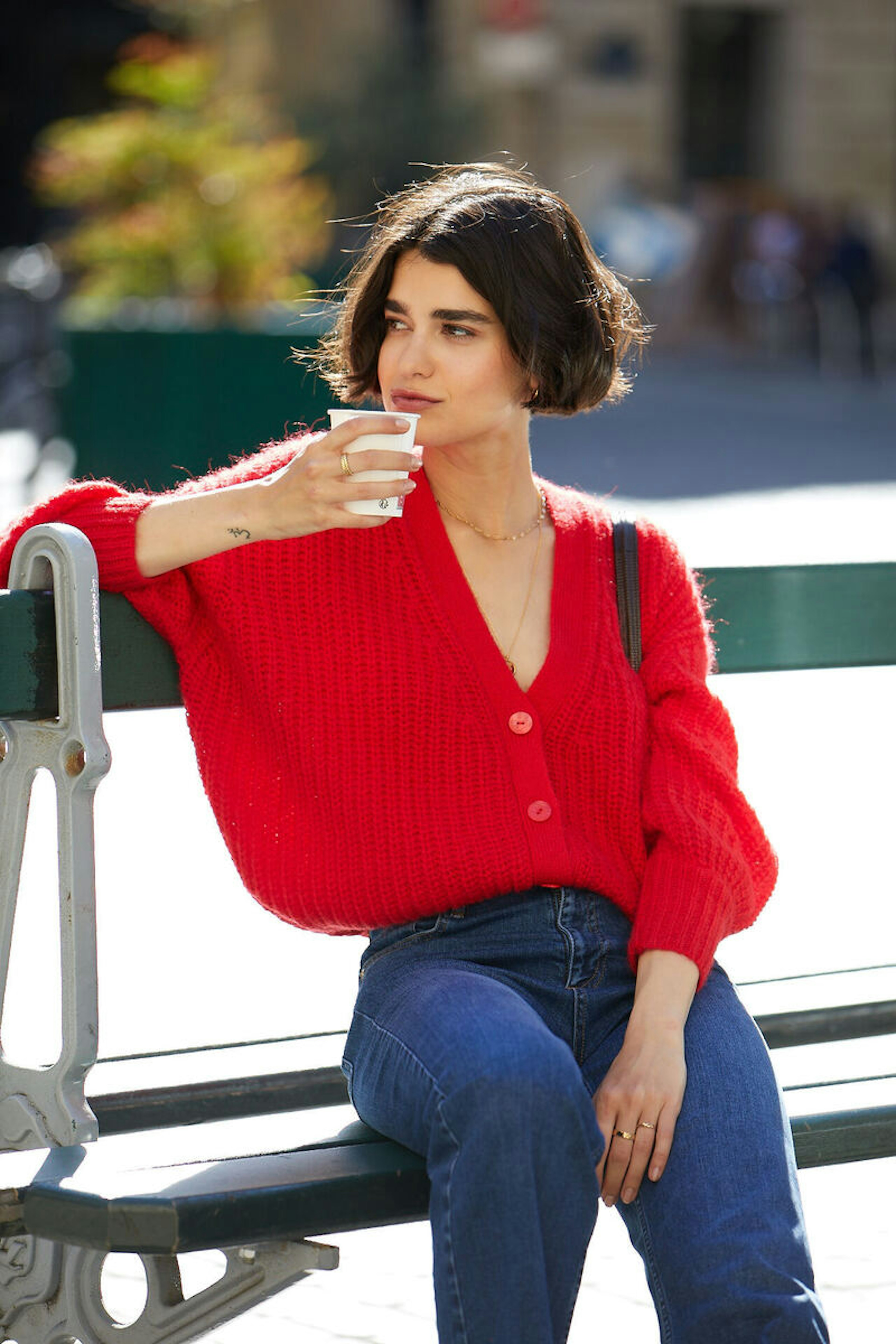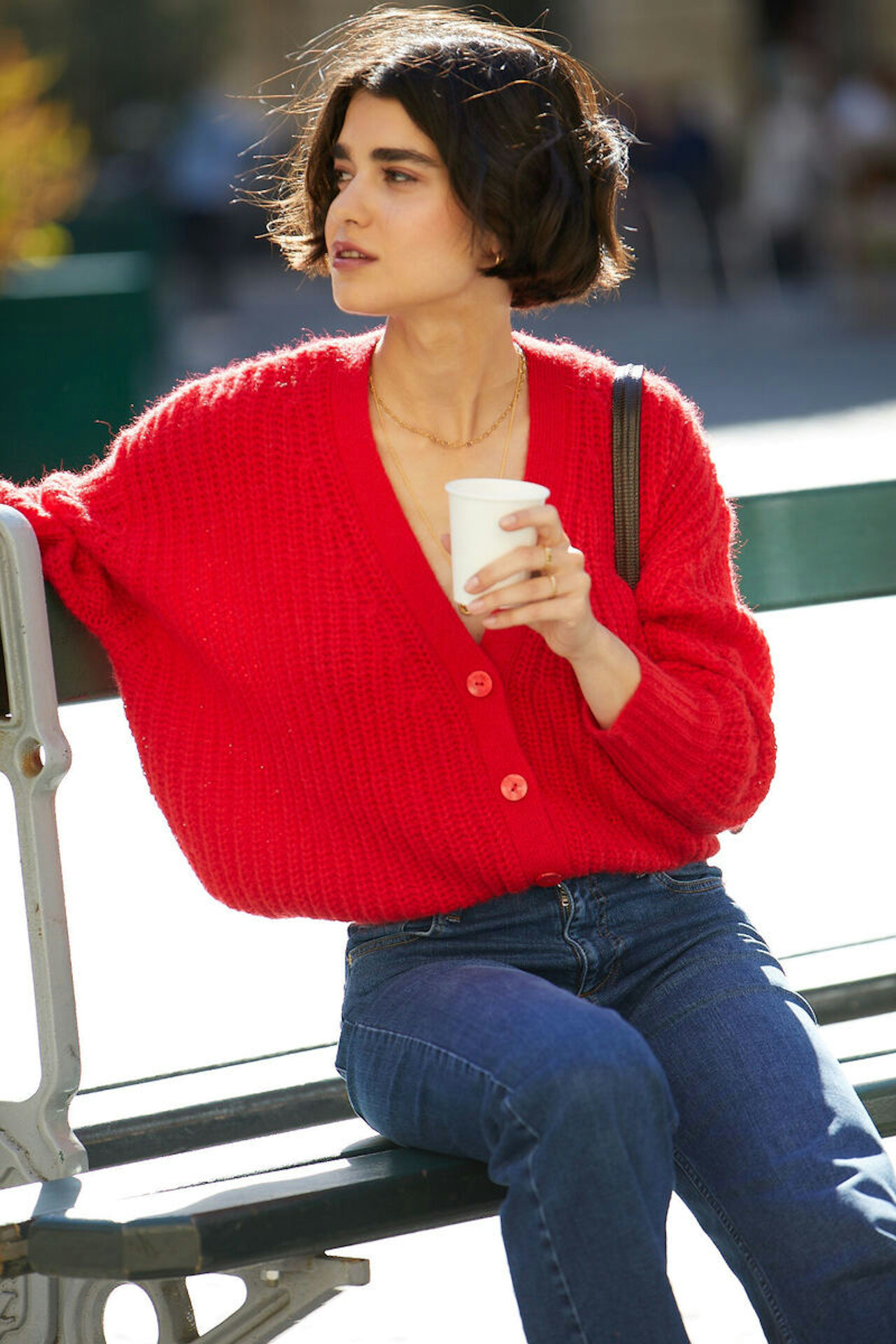 โGilet assez court, couleur moins rouge que sur la photo. Maille ร grosses cรดtes, assez lourd et pas trรจs doux.โ