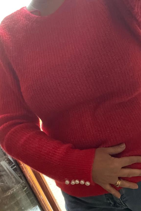 Portez ce pull avec un pantalon noir et des bottines, parfait pour les journées fraîches d'hiver. • Pull doux en laine • Col rond classique • Manches longues élégantes • Coupe décontractée • Détails de perles aux poignets