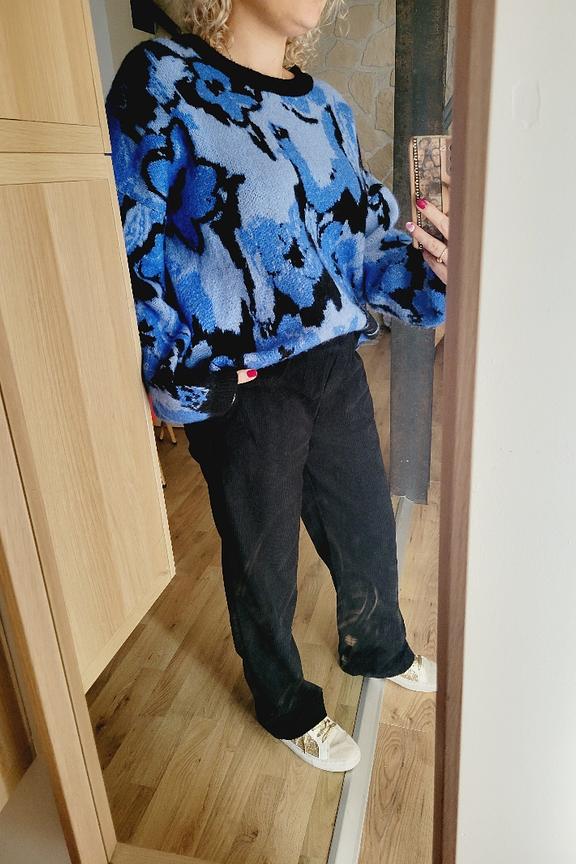 Pour un style unique et audacieux cet hiver, associez ce pull à un pantalon en cuir noir et des bottines à talons. Parfait pour affronter le froid avec élégance ! • Pull ample en laine • Manches longues • Col rond • Imprimé bleu et noir • Longueur normale de 62 cm en taille XS