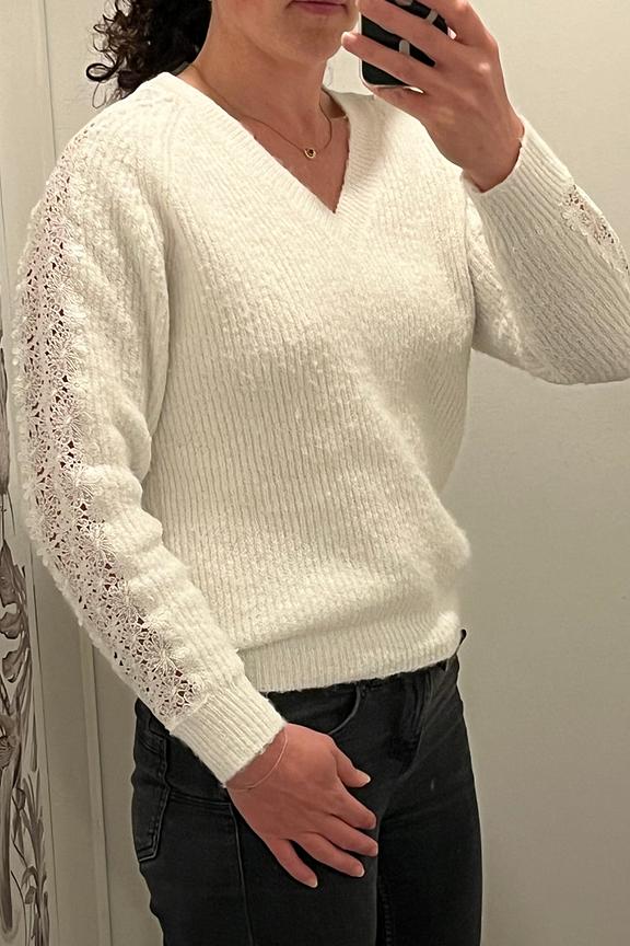 Portez ce pull avec un jean slim et des bottines pour une allure à la fois confortable et raffinée. Idéal pour les journées fraîches d'hiver. • Pull avec détails en mohair • Col en V flatteur • Manches longues en dentelle • Coupe légèrement ample • Maille douce et élégante