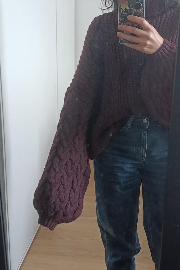 Associez ce pull audacieux ร un jean taille haute pour un style confort et chic. Parfait pour les journรฉes fraรฎches d'automne ou d'hiver. โข Pull ample โข Manches bouffantes โข Col montant โข Tricot torsadรฉ โข Teinte rouge vibrante