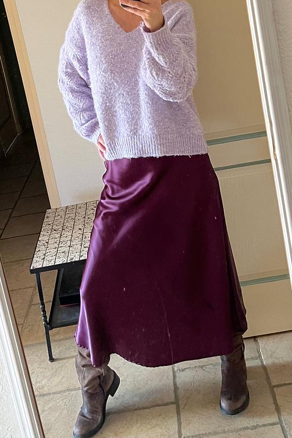 โข La taille unique convient du 34 au 42 โข Pull violet ร col en V โข Coupe ample โข Finitions bord-cรดtes โข Texture duveteuse