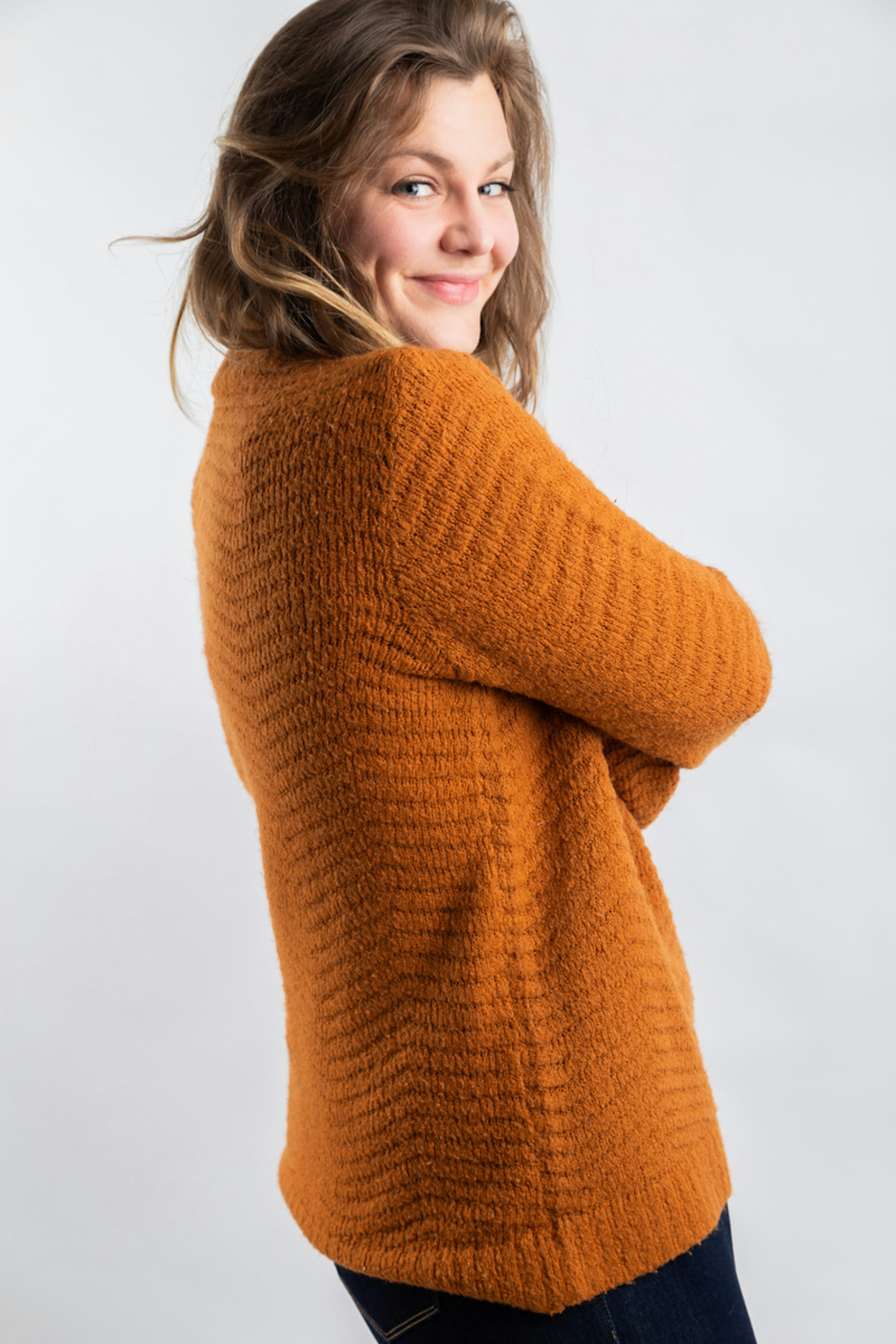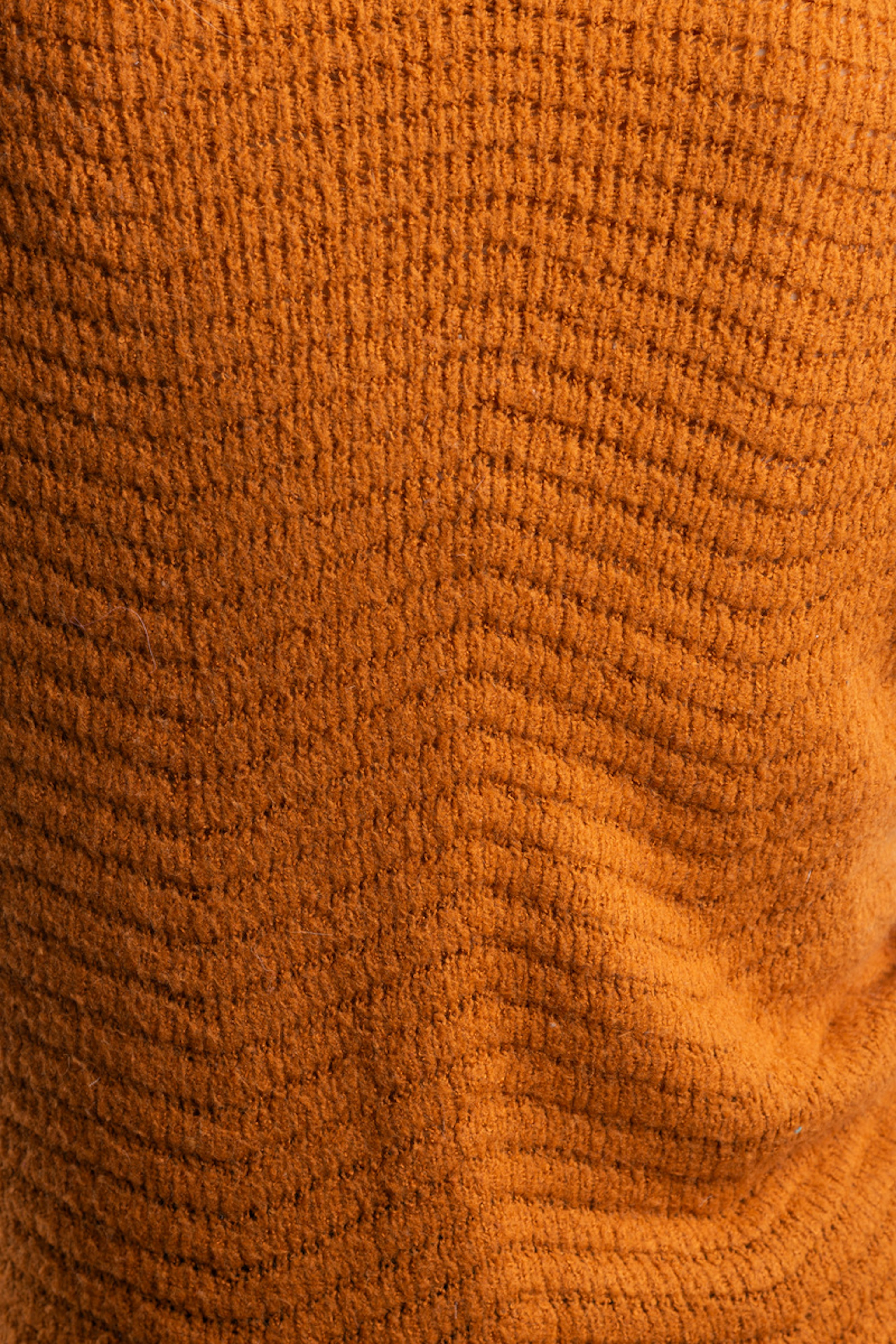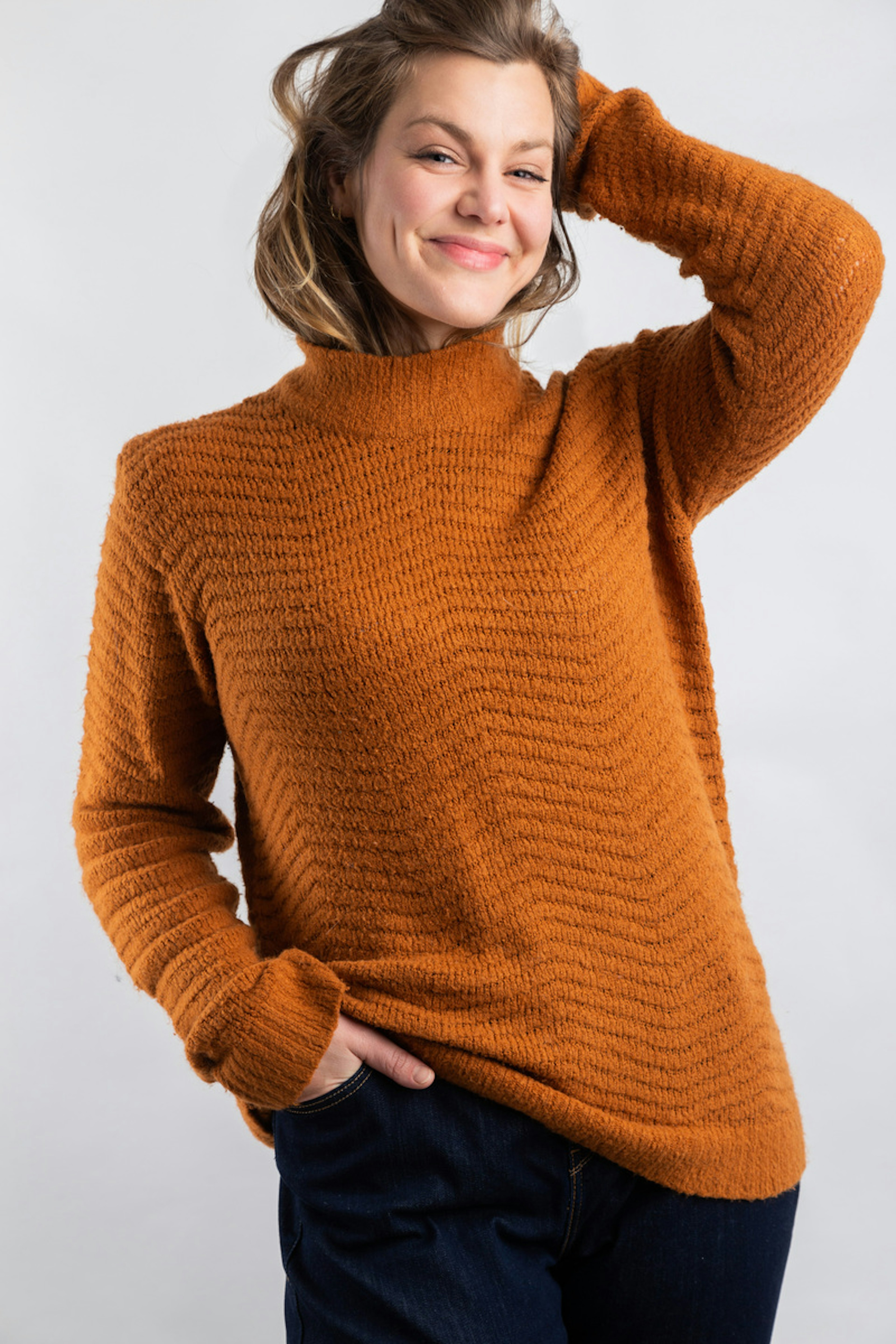 โข Pull marron ร manches longues โข Dรฉtails en mailles tressรฉes โข Col montant โข Matiรจre chaude et duveteuse โข Coupe classique