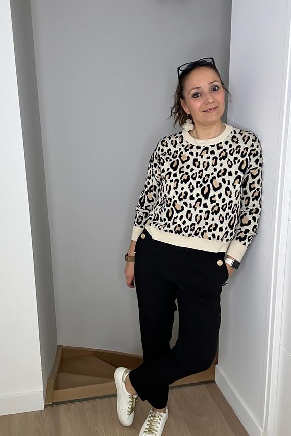 โข Pull ร manches longues imprimรฉ lรฉopard beige et noir โข La taille unique convient du 34 au 42 โข Col rond โข Finitions bords-cรดtes โข Coupe droite