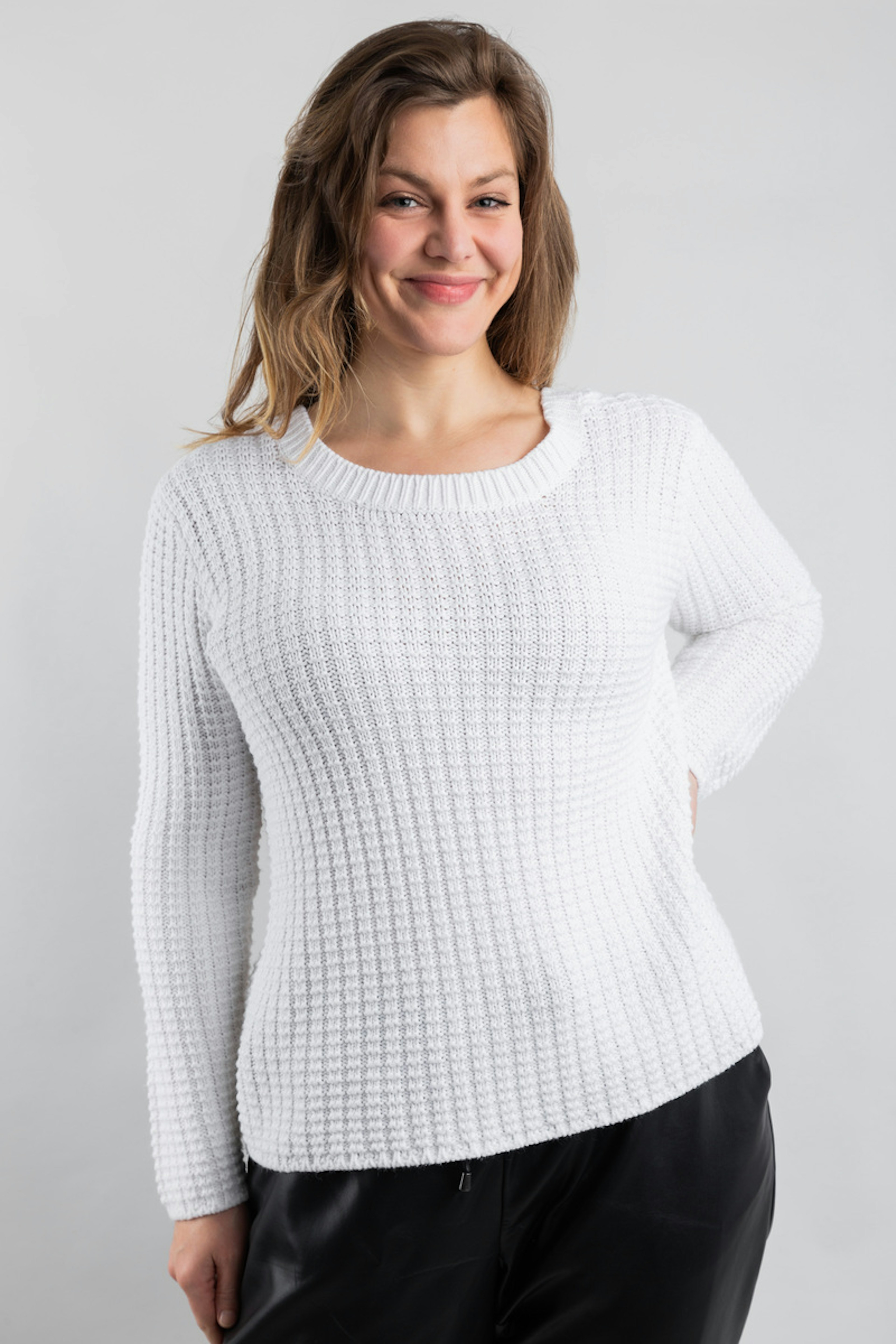 โข Pull ร manches longues blancs โข Col rond dรฉgagรฉ โข Bords cรดtes โข Dos dรฉgagรฉ en V โข Coupe classique
