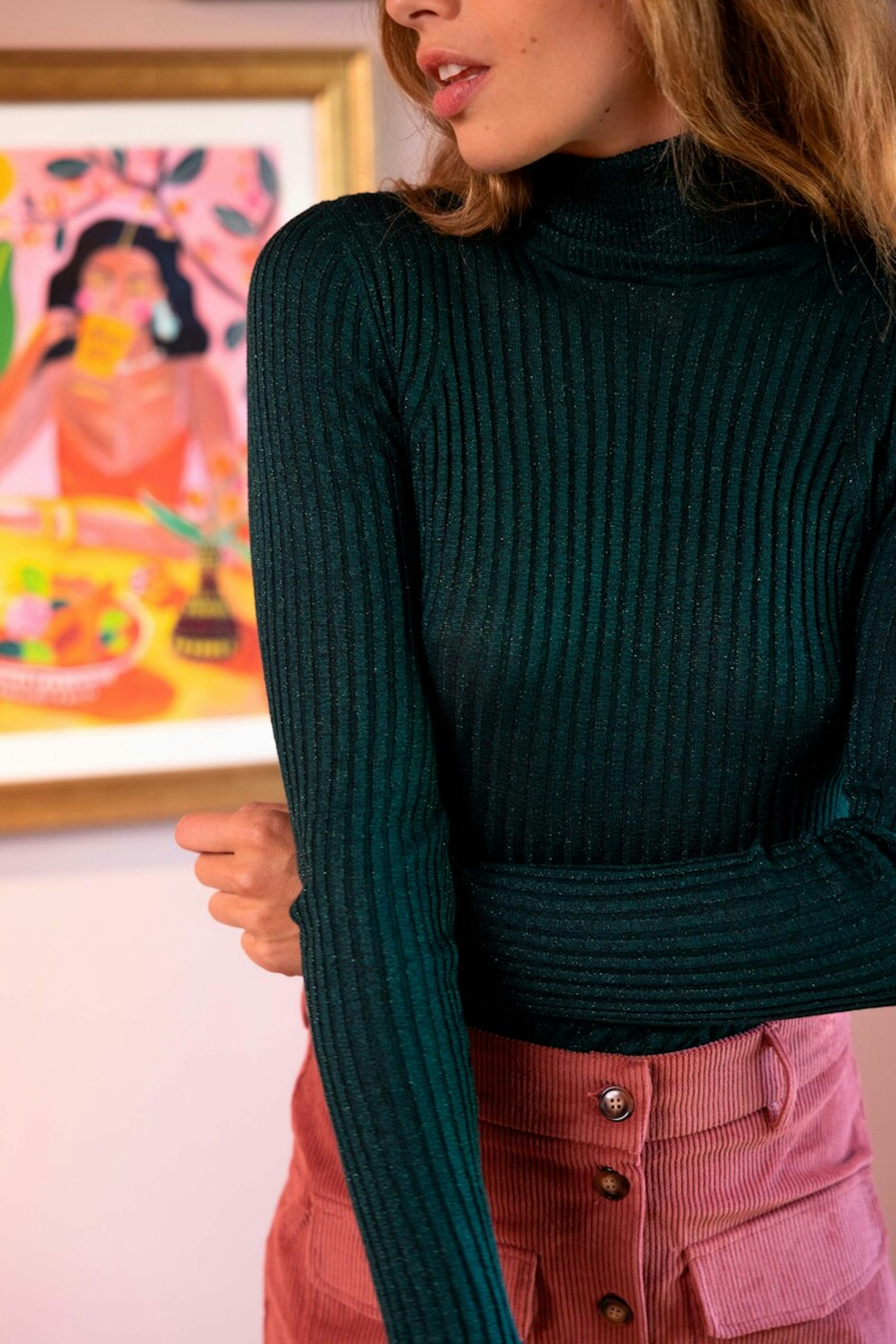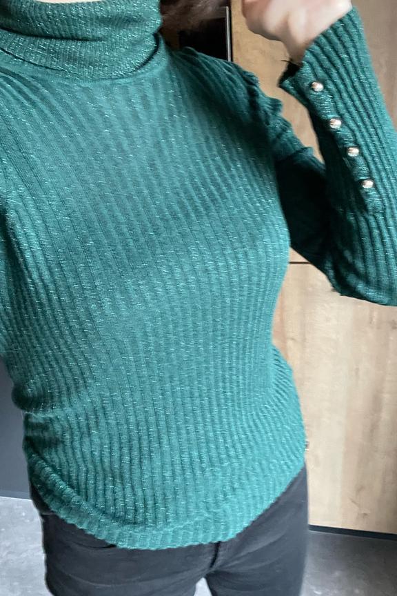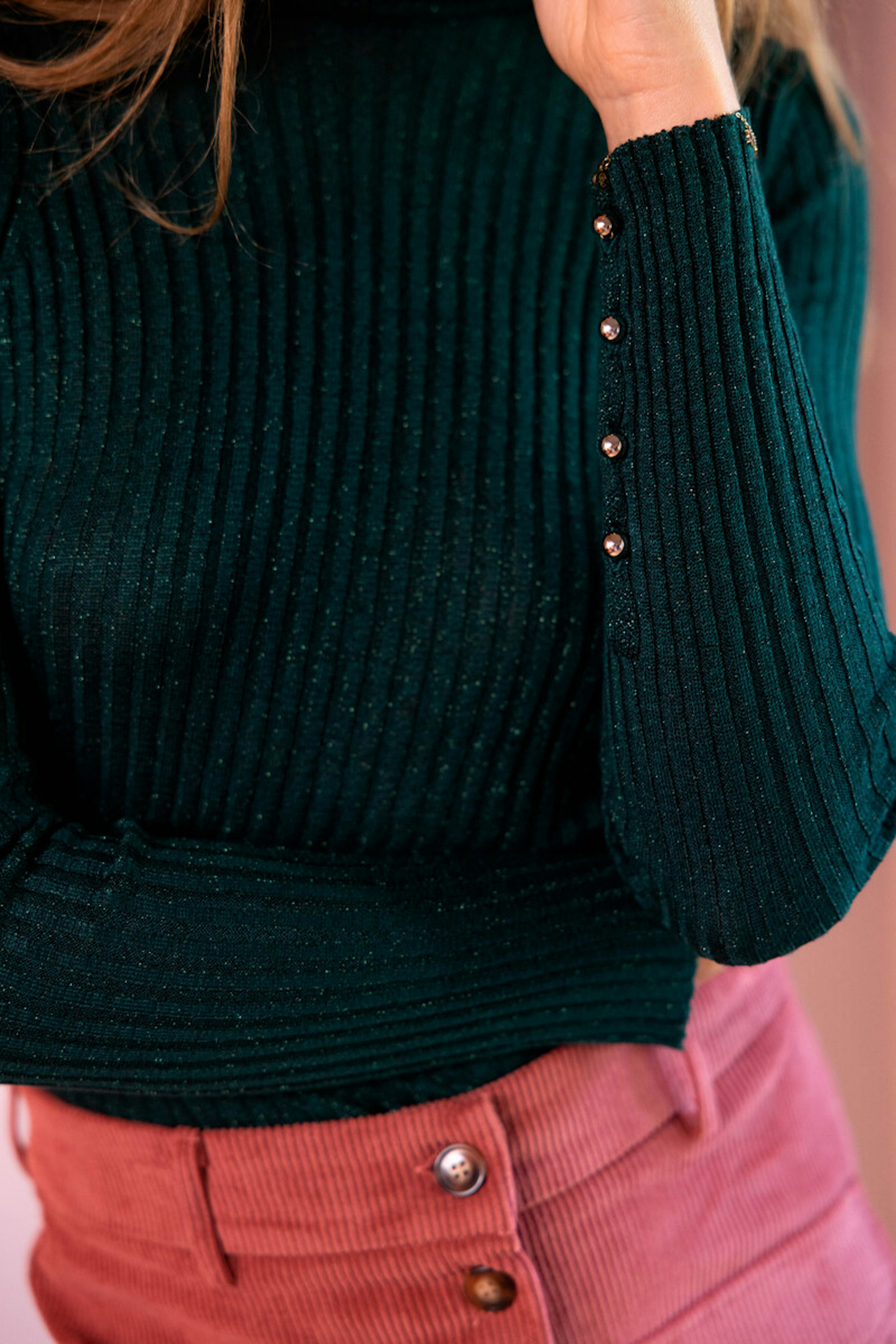 โข Pull col roulรฉ vert sapin โข Coupe trรจs prรจs du corps โข Maille pailletรฉe et cรดtelรฉe โข Boutons dorรฉs aux manches โข Mรฉdaillon dorรฉ gravรฉ LPE