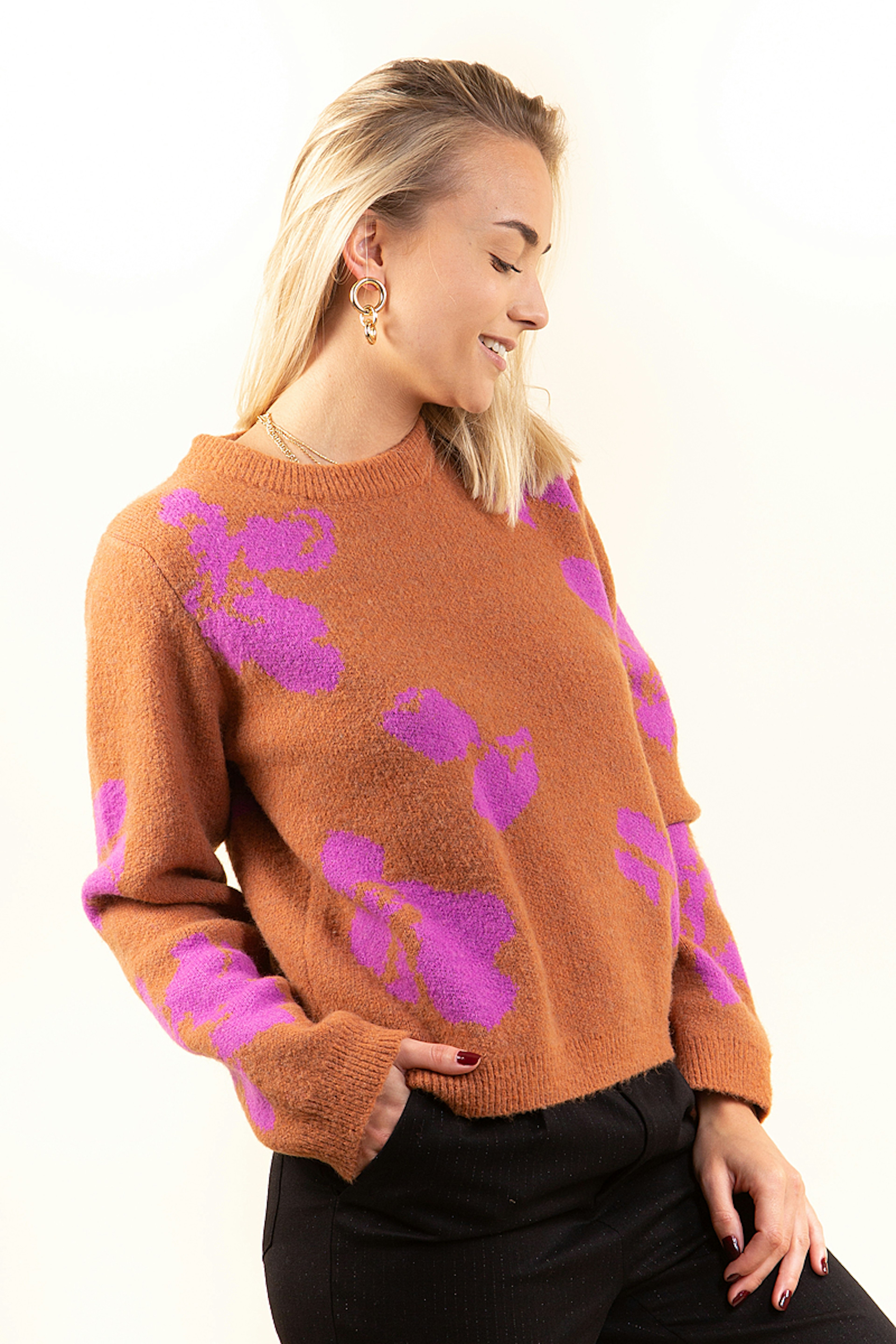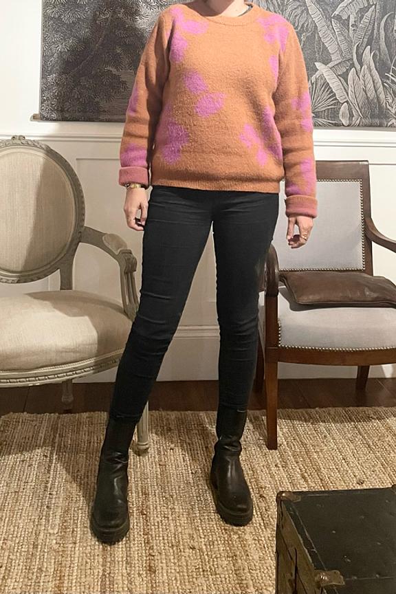 โข Pull marron et fuschia โข Design arty et original โข Col rond โข Contient de la laine pour vous tenir bien au chaud