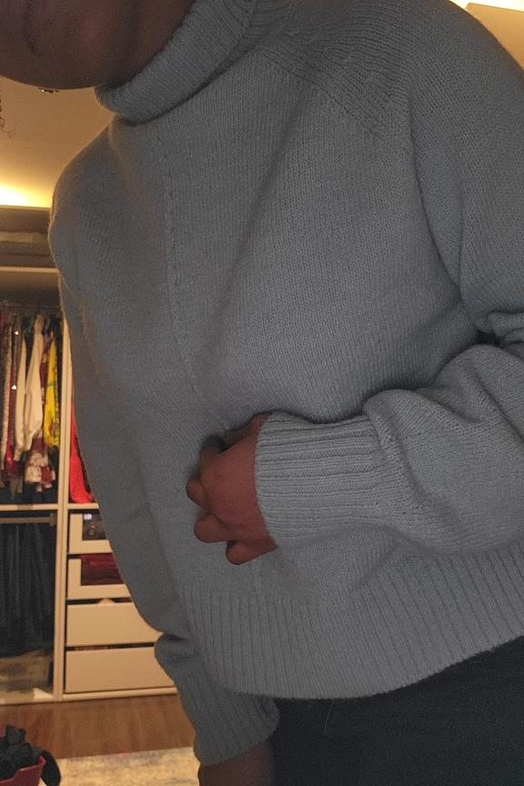 “C’est simple, ma mère (on partage notre Closet :) l’a reçu et ne l’a plus lâché :) Coupe légèrement cropped, flatteuse, jolie maille douce avec ce beau bleu/vert. Elle l’a même acheté tellement elle était fan!”