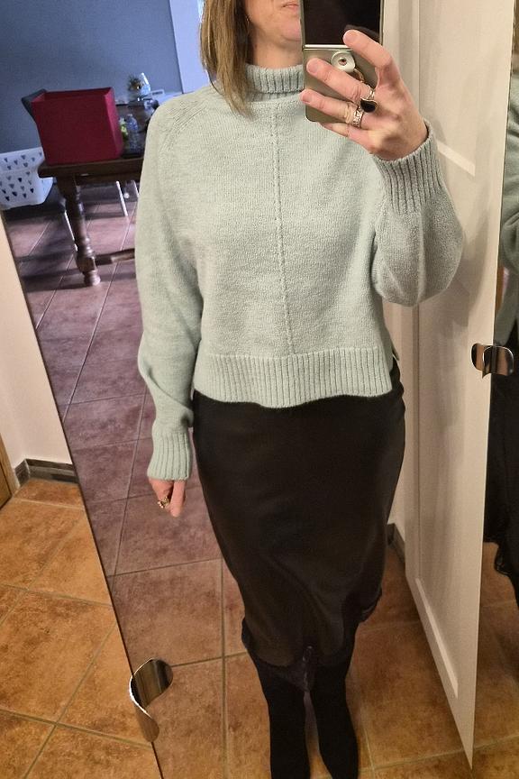 Associez ce pull douillet à une jupe en cuir pour un look chic et décontracté, parfait pour les journées d'hiver. Ajoutez des bottines et un sac à main tendance. • Pull à col montant • Manches longues amples • Coupe décontractée • Texture côtelée aux poignets • Teinte vert tendre