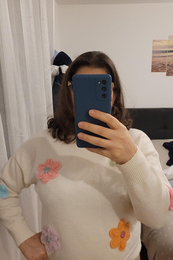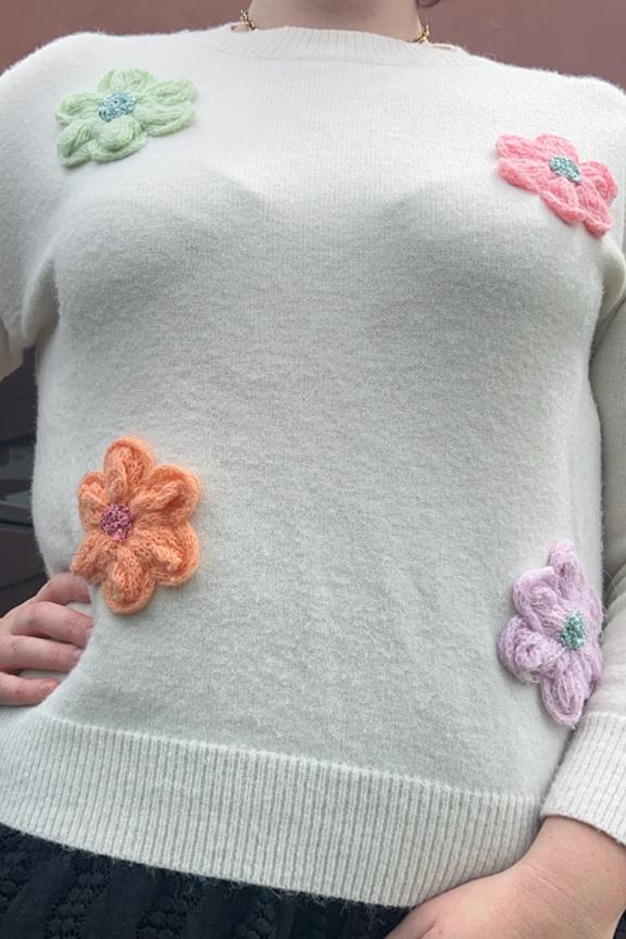 Pour un look hivernal tout en douceur, associez ce pull écru avec des jeans skinny et des bottines en daim. Ajoutez un manteau long en laine pour une tenue chic et cosy. Idéal pour affronter les journées froides avec style. • Pull en laine • Coupe décontractée • Manches longues • Col rond • Motif fleurs