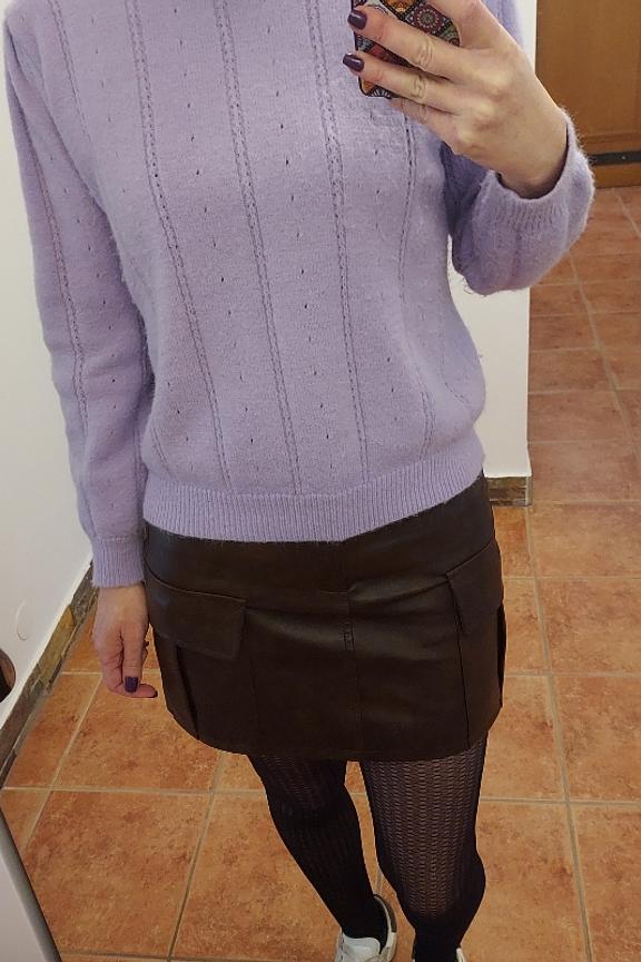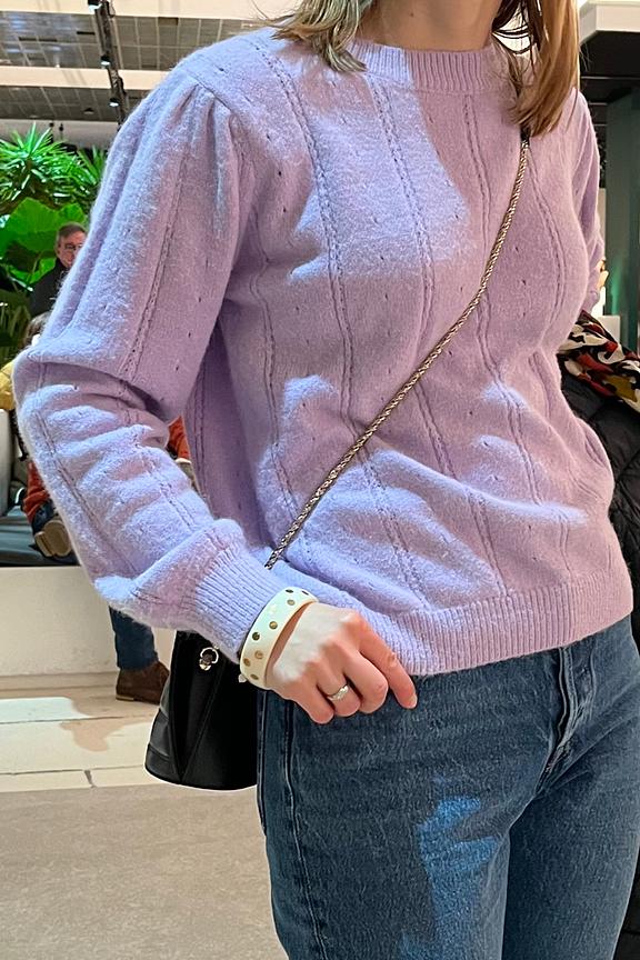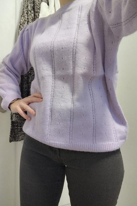 โข Pull lilas ร col rond โข La taille unique convient du 34 au 42 โข Manches longues โข Lรฉgรจrement ajourรฉ โข Finitions bords-cotes โข Contient de la laine