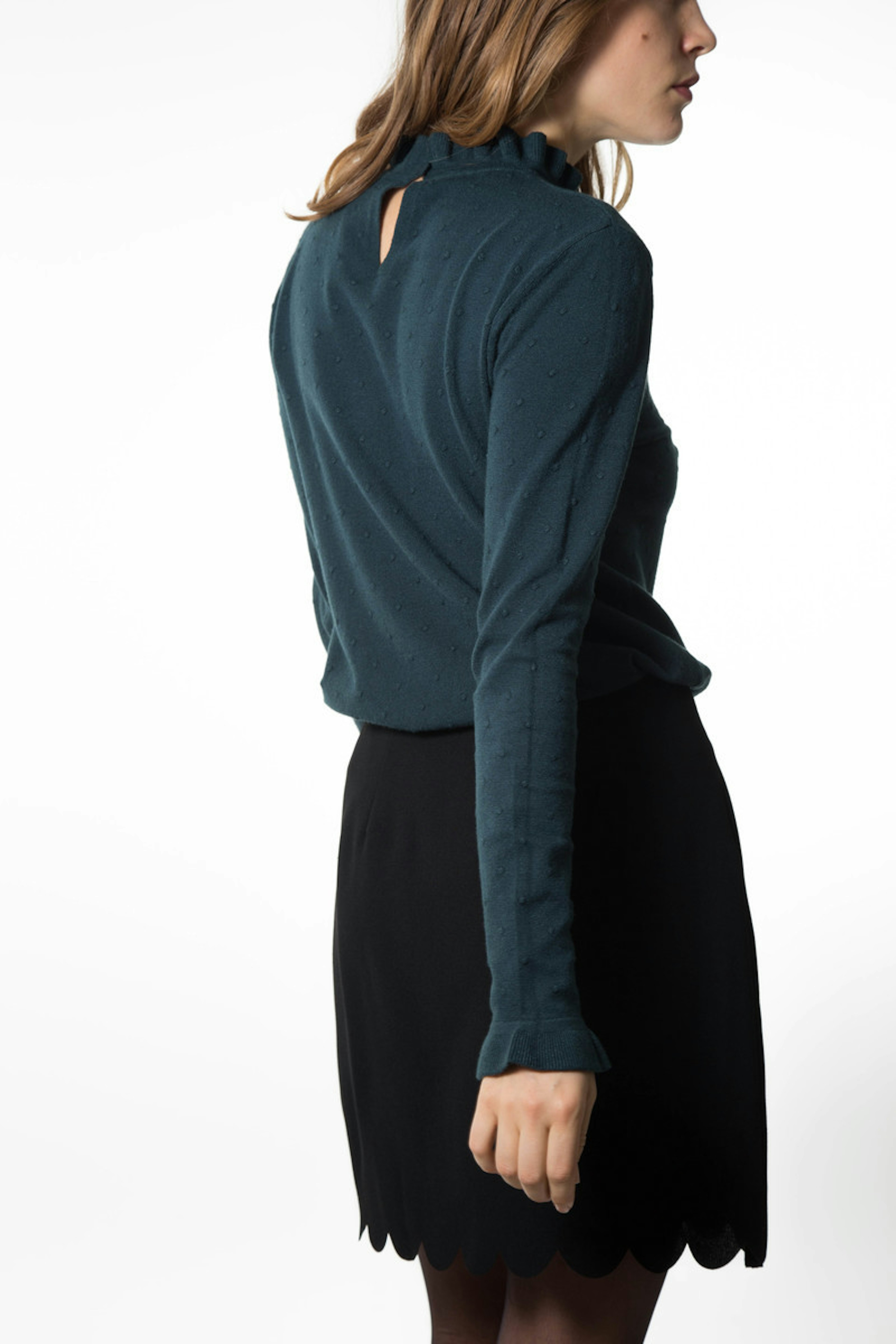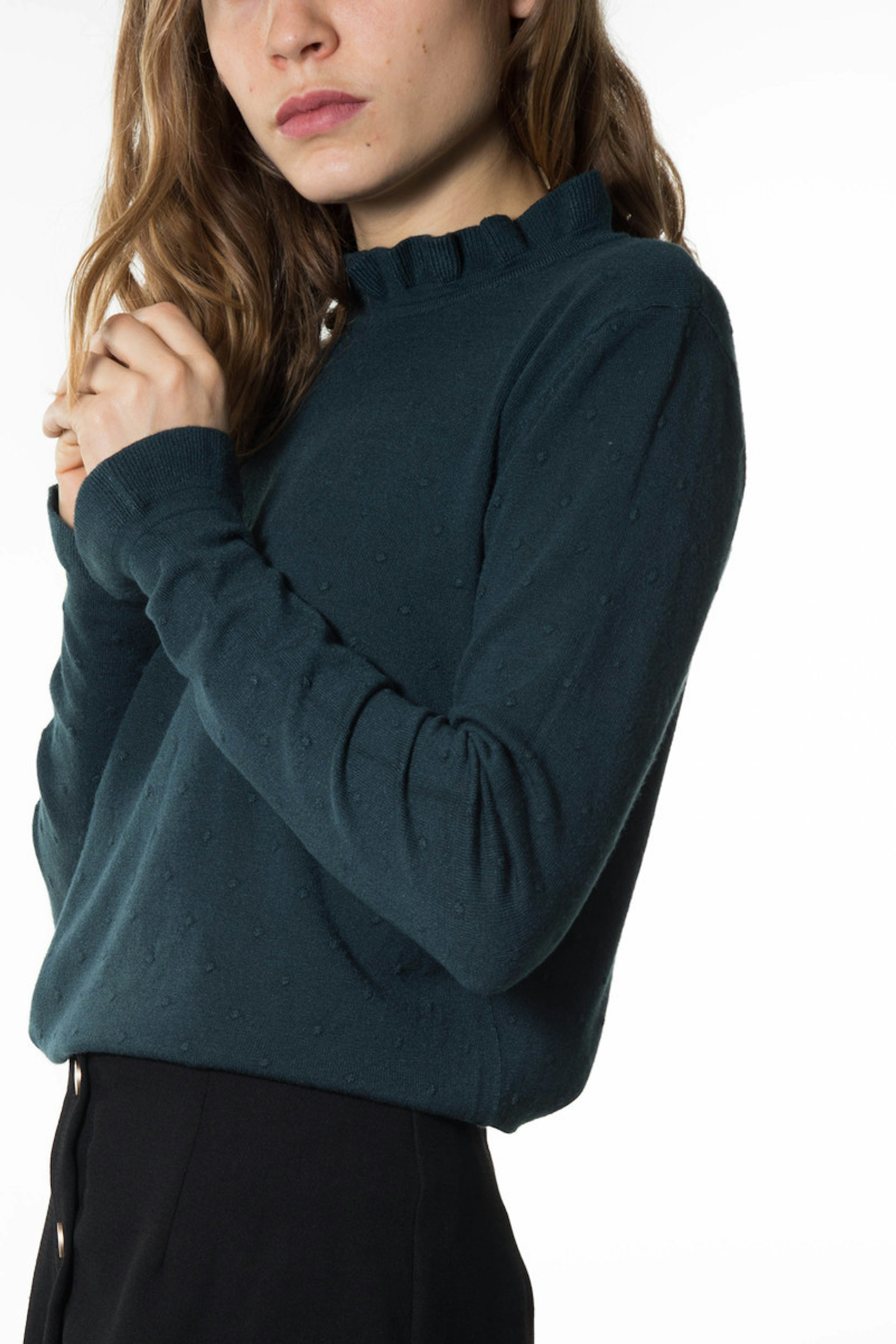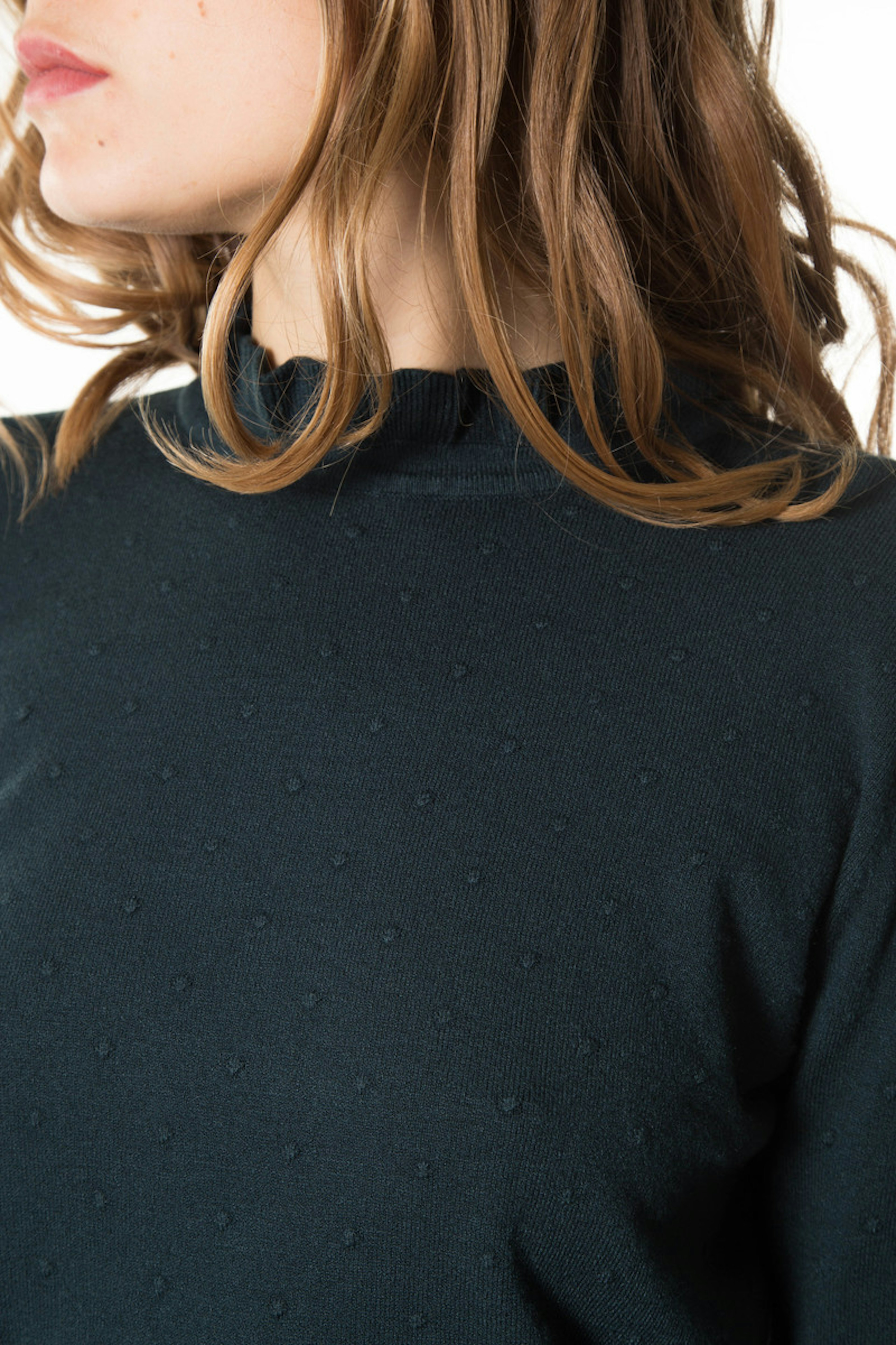 Envie de relief ? Choisissez le pull Lili et son coloris vert sapin ! Son imprimรฉ pois brodรฉ ton sur ton et son col rond rabattu le rendent moderne !