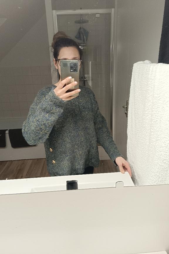 Associez ce pull cosy avec un jean taille haute et des bottines pour une allure décontractée mais raffinée, parfait pour affronter l'hiver avec style. • Pull avec boutons décoratifs • Coupe légèrement ample • Col rond classique • Manches longues • Motif chiné
