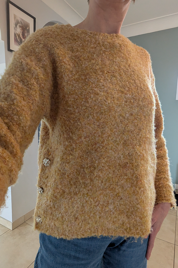 Associez ce pull avec un jean brut et des bottines pour un look hivernal plein de charme. • Pull doux et cosy • Coupe légèrement oversize • Manches longues confortables • Col rond classique • Détails boutons sur le côté