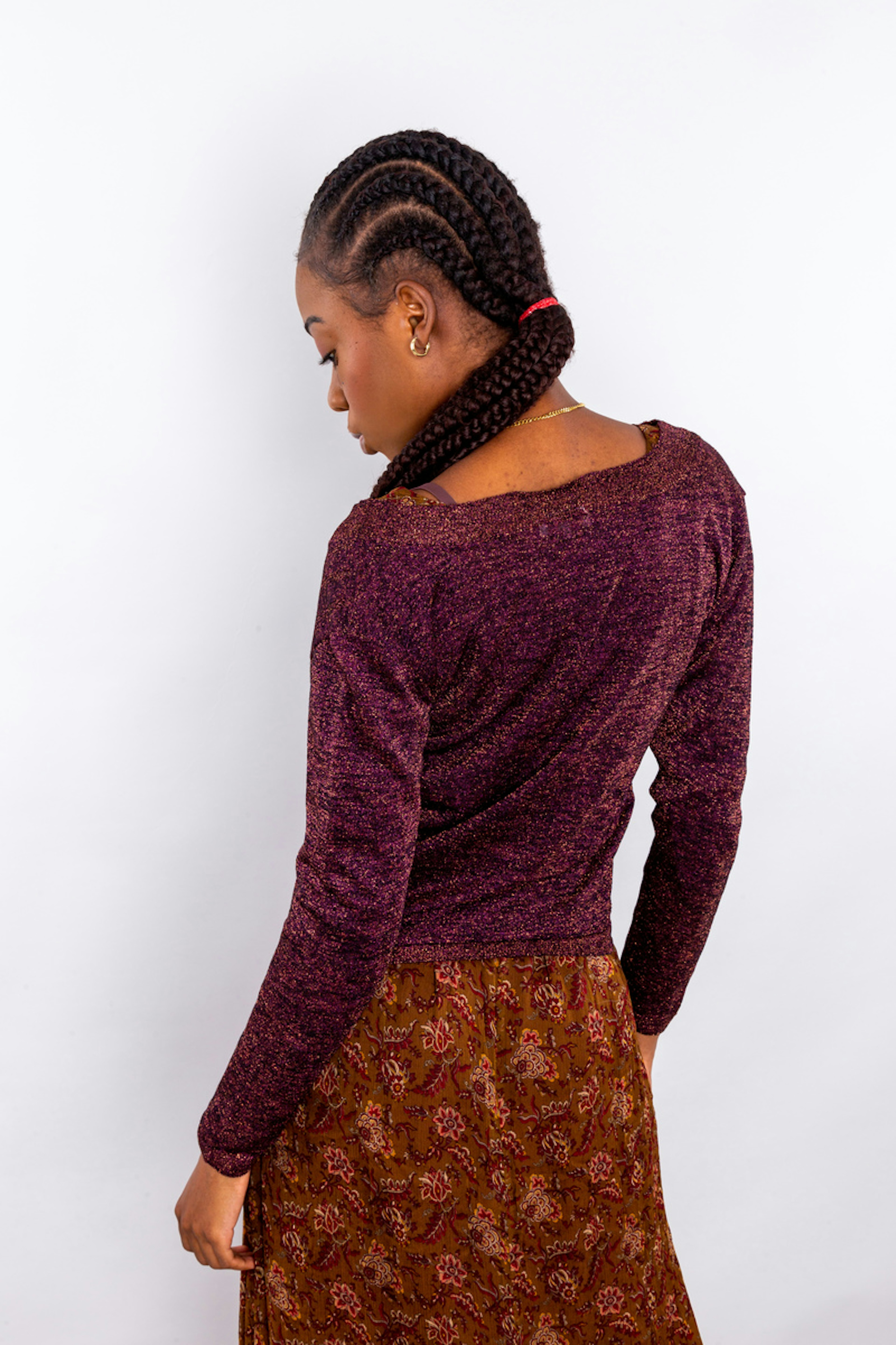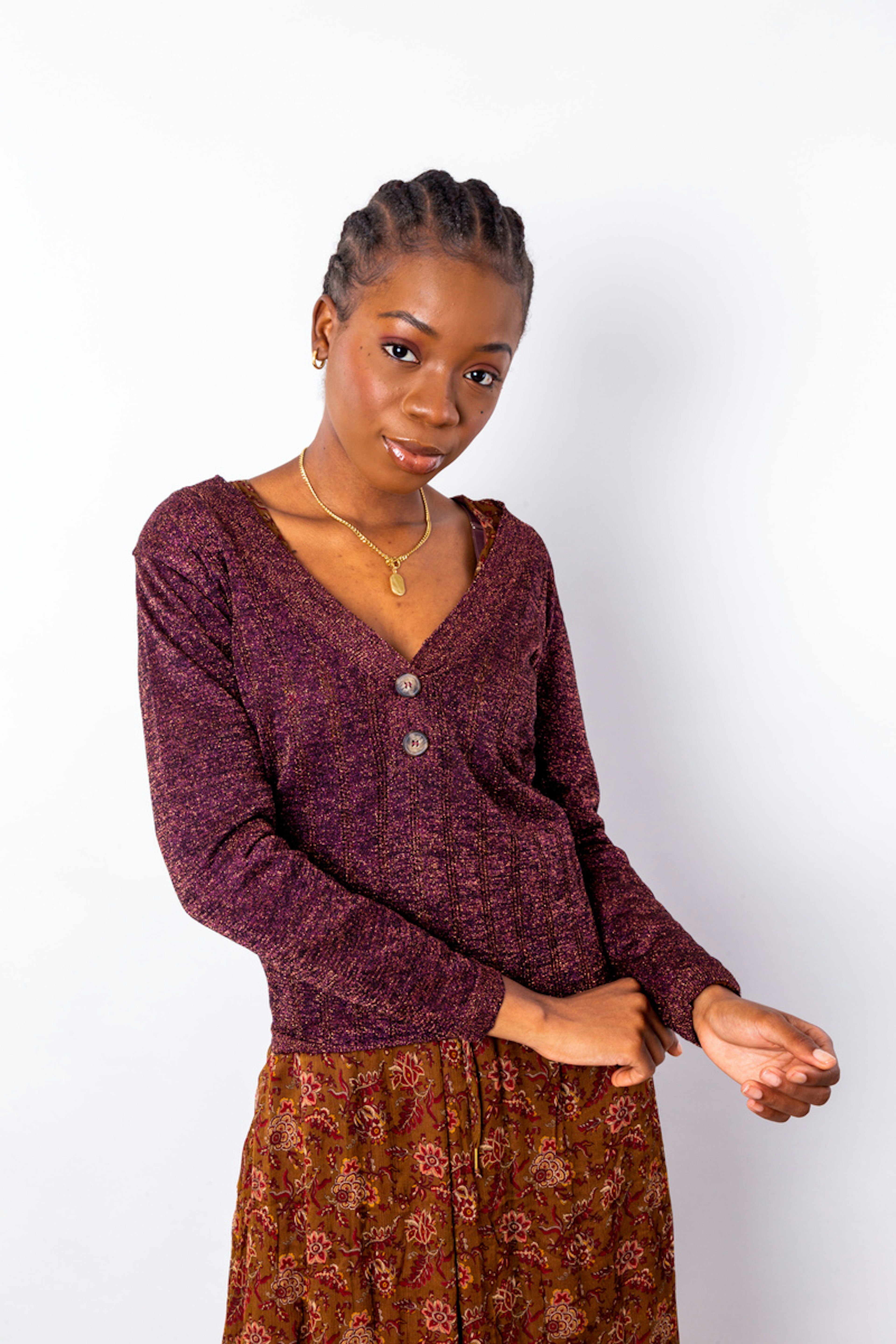 โข Pull en fine maille de couleur noisette โข Fins fils de Lurex mรฉlangรฉs โข Encolure en V soulignรฉe de deux boutons ร l'esprit vintage โข Fabriquรฉ en Italie