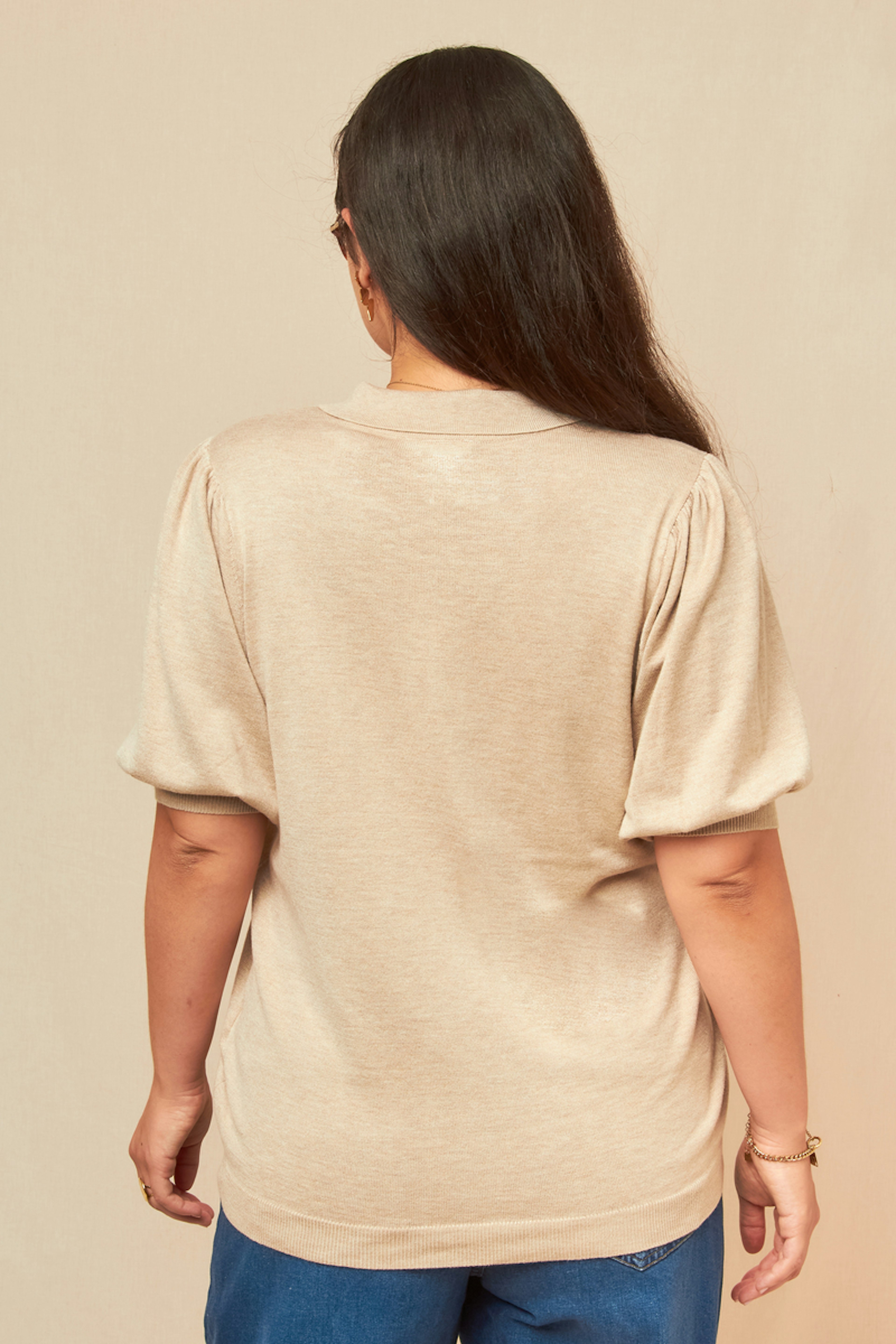 Pour un look chic et décontracté, associez ce pull à un pantalon à pinces et des bottines en cuir. Idéal pour les fraîches journées hivernales. • Pull beige • Col polo classique • Manches bouffantes • Tissu léger et doux • Fermeture à boutons