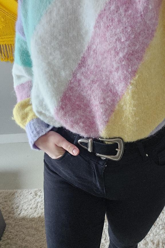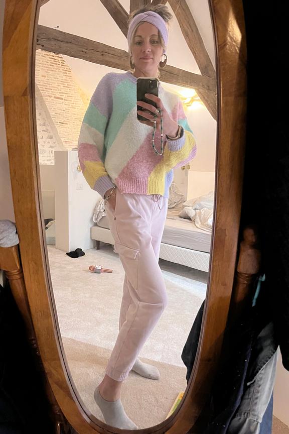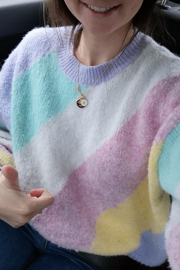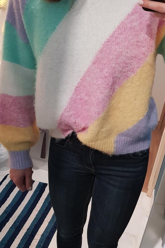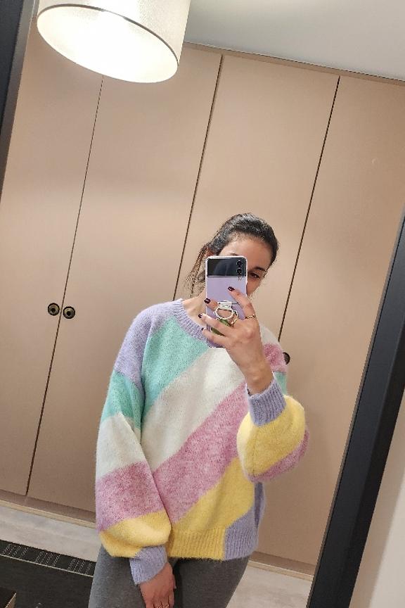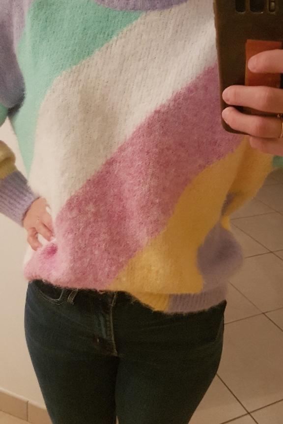 โข Convient du 34 au 42 โข Pull doux multicolore pastel en laine mรฉlangรฉe โข Manches longues โข Col rond โข Longueur environ 65 cm โข Longueur des manches environ 45 cm โข Largeur sous aisselles Environ 58 cm โข Se porte lรฉgรจrement loose