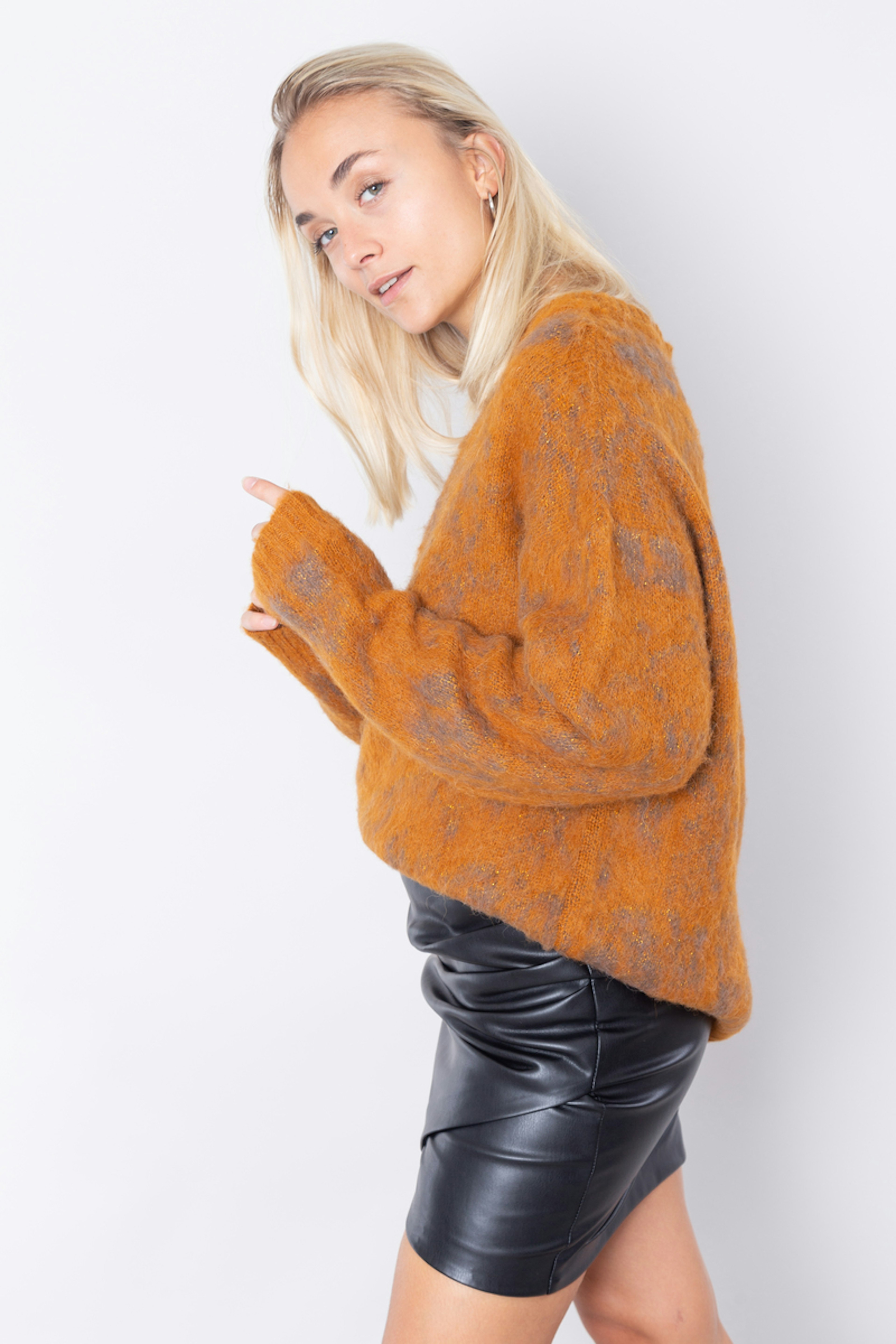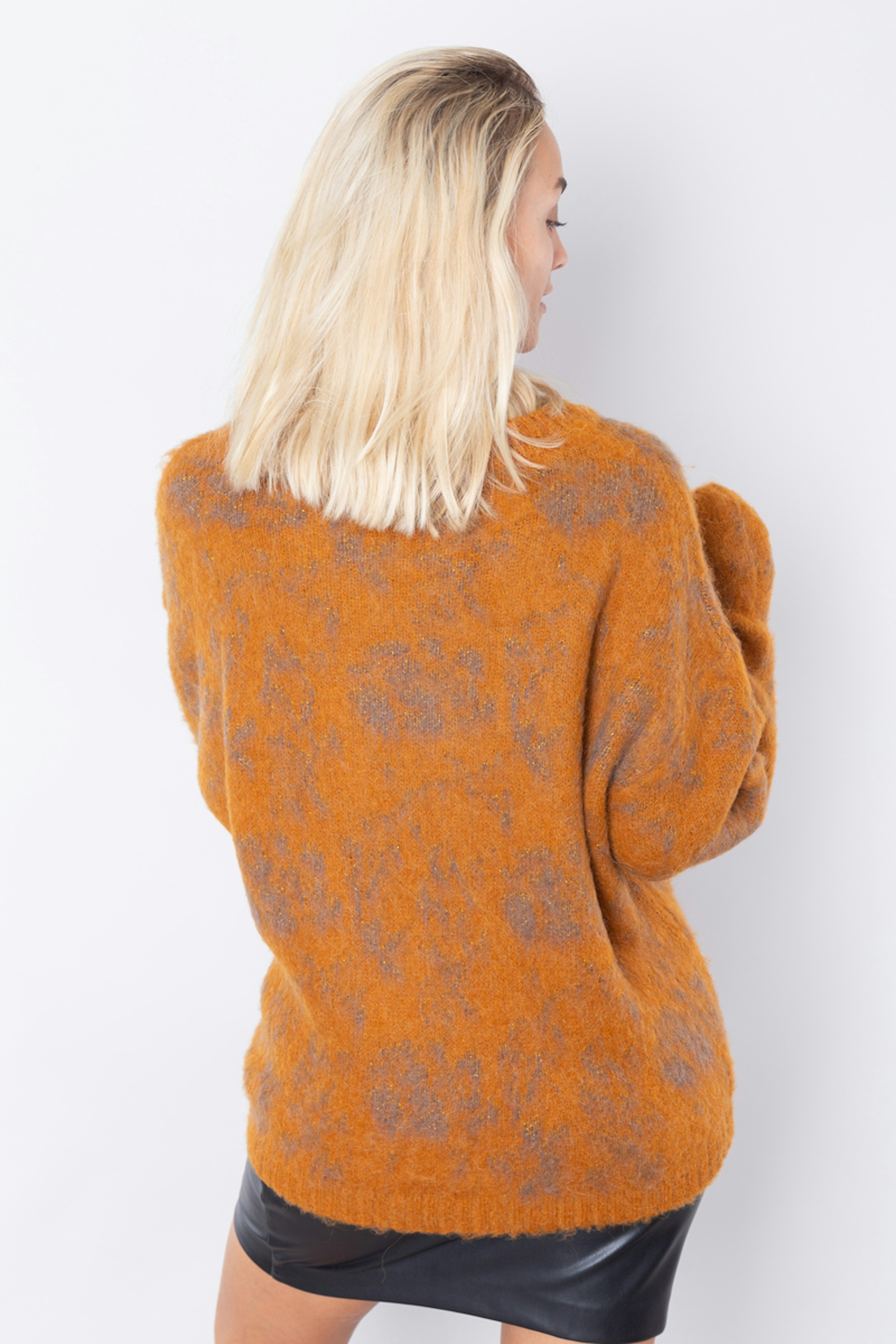 โข Pull en mailles orange avec imprimรฉs abstraits gris โข Manches longues โข Col rond โข Ourlets cรดtelรฉs โข Coupe lรฉgรจrement oversize