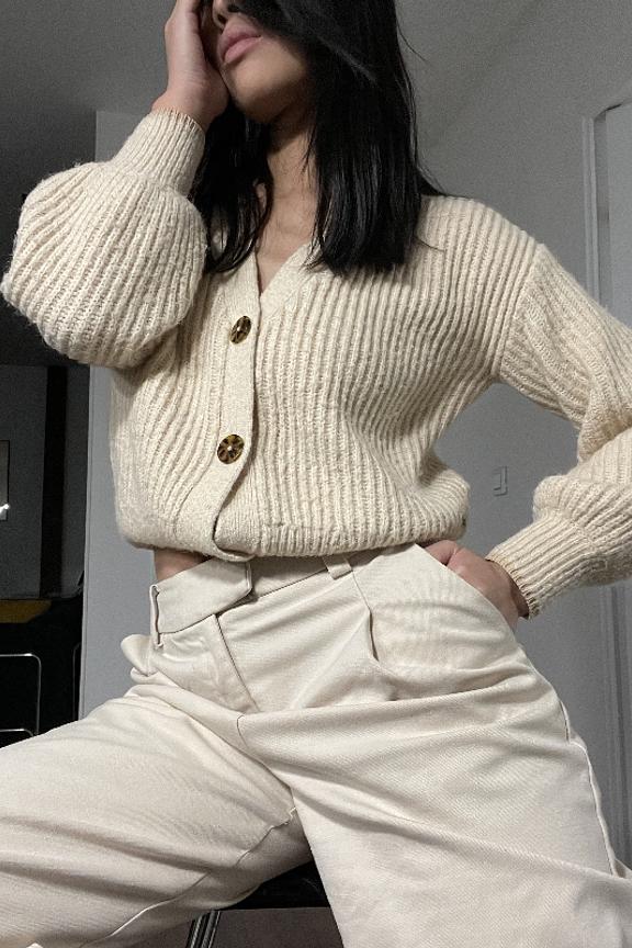 โข Cardigan ร manches longues โข Col en V โข Fermeture 3 boutons sur le devant โข Coupe droite โข Contient de la laine et de l'alpaga, idรฉal pour l'hiver