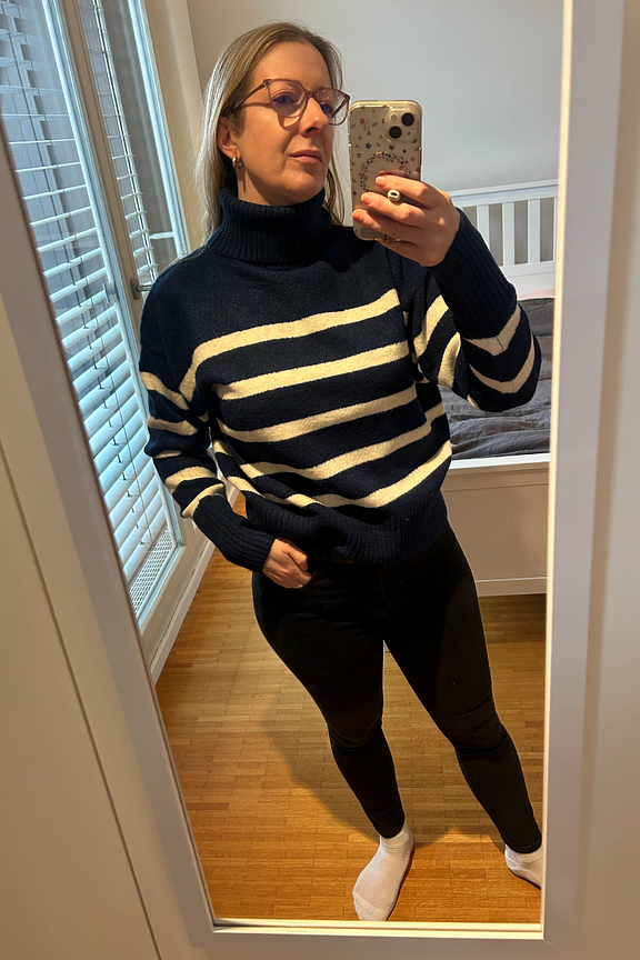 Ajoutez du chic à vos journées hivernales en associant ce pull avec un pantalon blanc élégant et des bottines noires. • Pull à rayures • Col roulé • Manches longues • Coupe ample • Rayures bleu et blanc