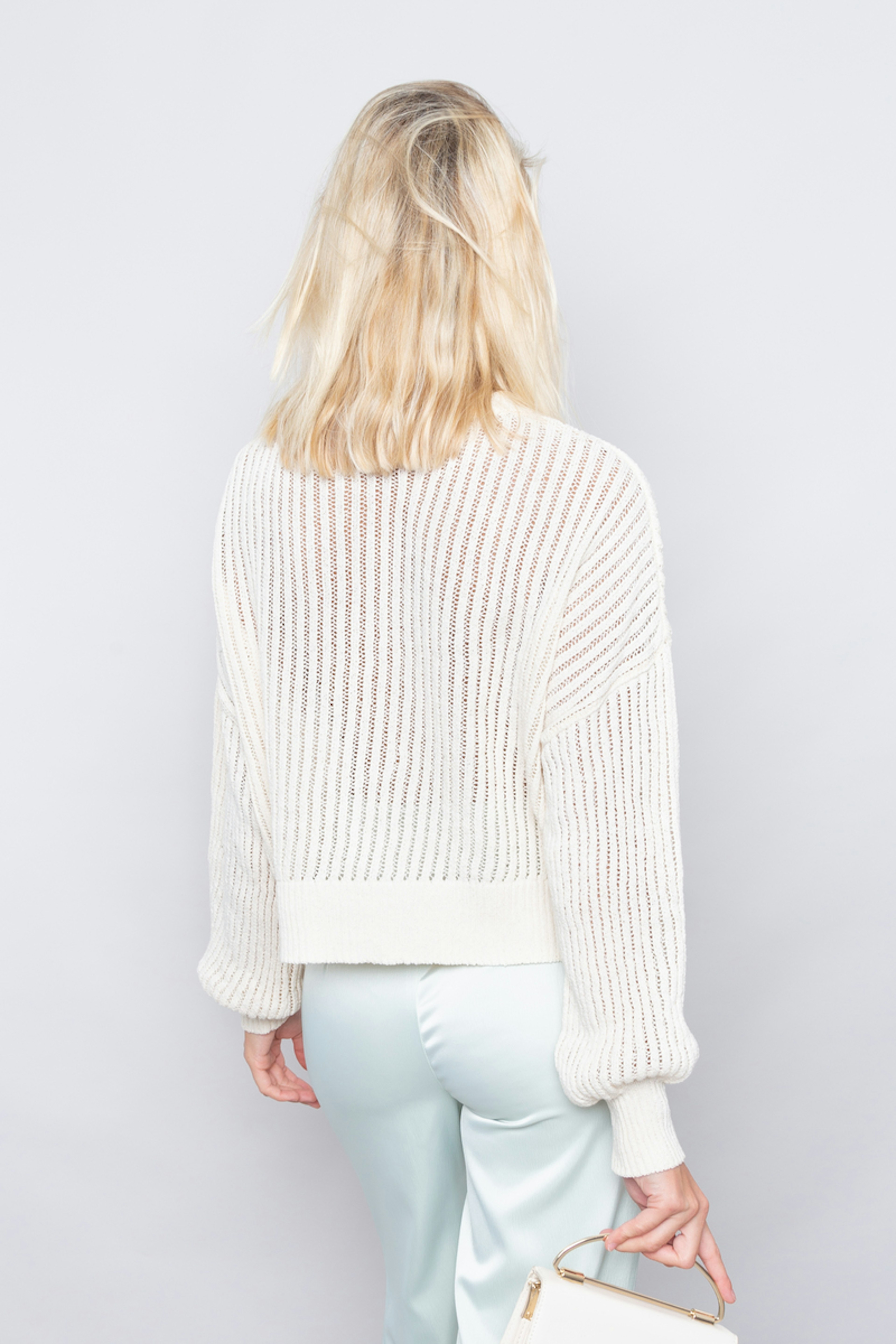 โข Pull en mailles fines couleur รฉcru โข Ourlets cรดtelรฉs โข Manches longues โข Col ras du cou