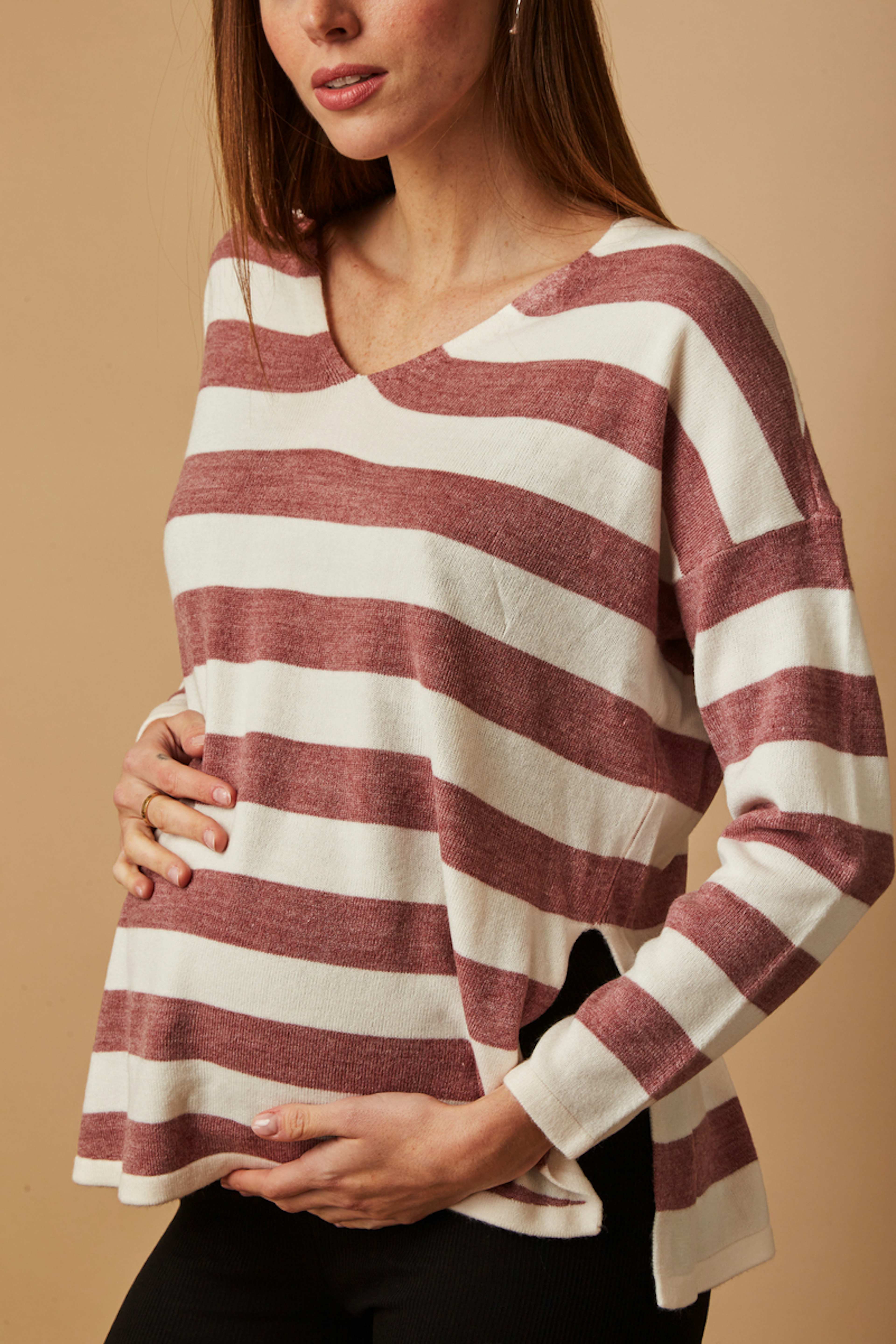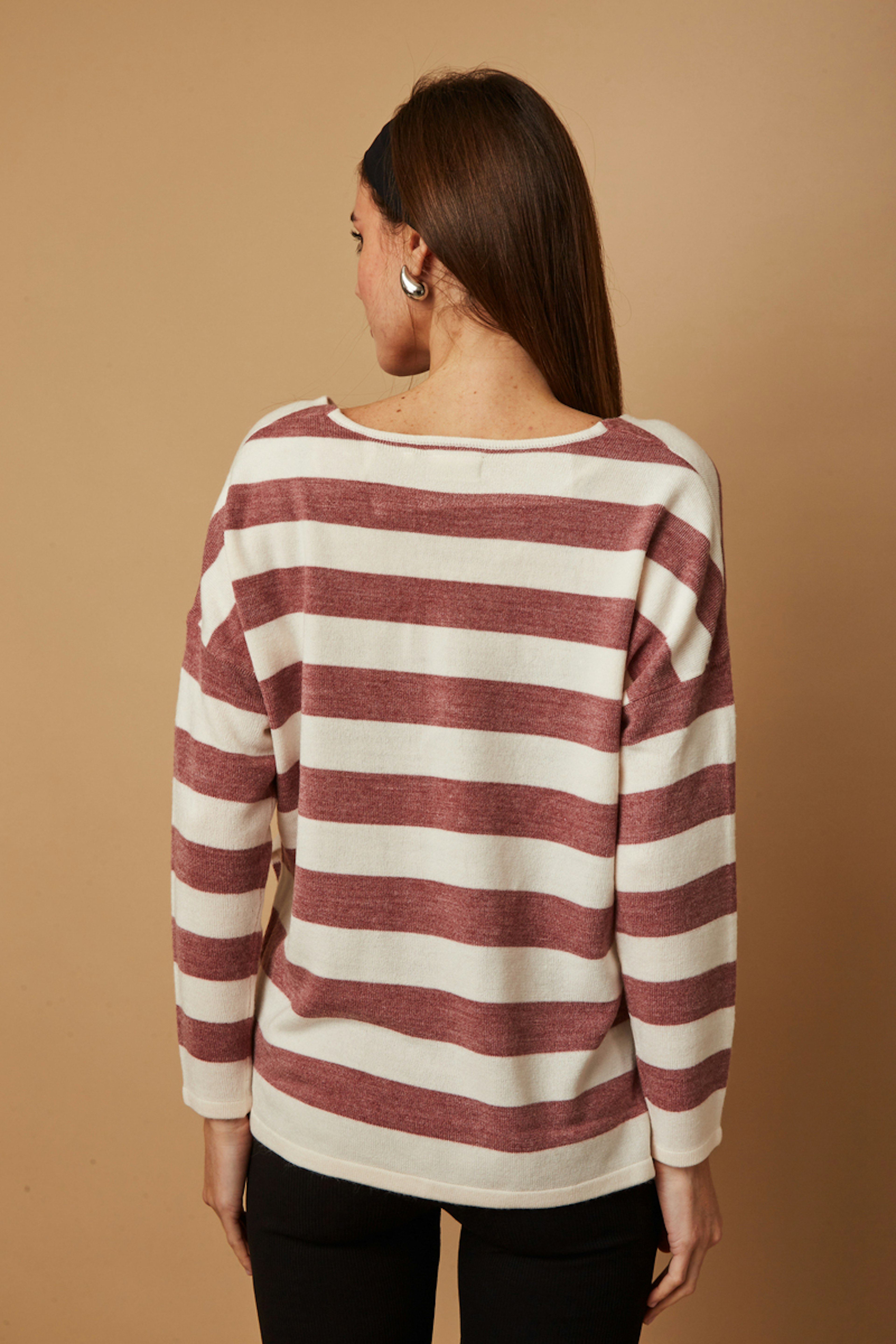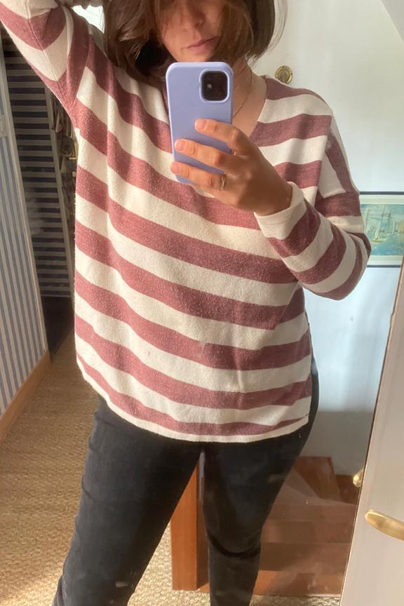 Enveloppez-vous de douceur avec ce pull, parfait pour un look dรฉcontractรฉ chic ร toute saison. โข Pull ample โข Coupe confortable โข Rayures horizontales rouge