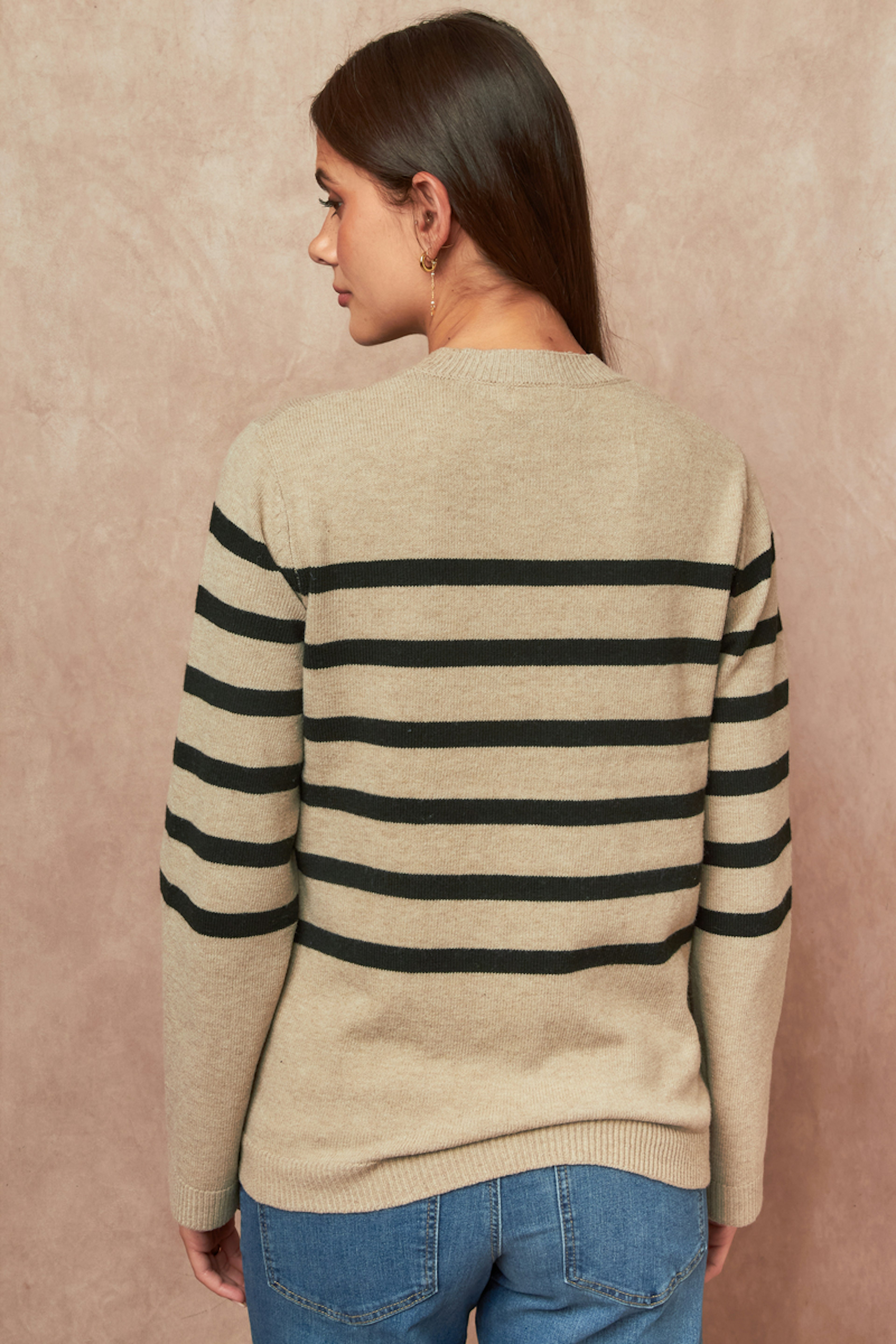 Portez ce pull rayé avec un jean slim et des bottines pour un look chic et décontracté, parfait pour l'hiver. • Pull en maille douce • Manches longues • Coupe droite • Rayures horizontales • Boutons décoratifs sur le côté