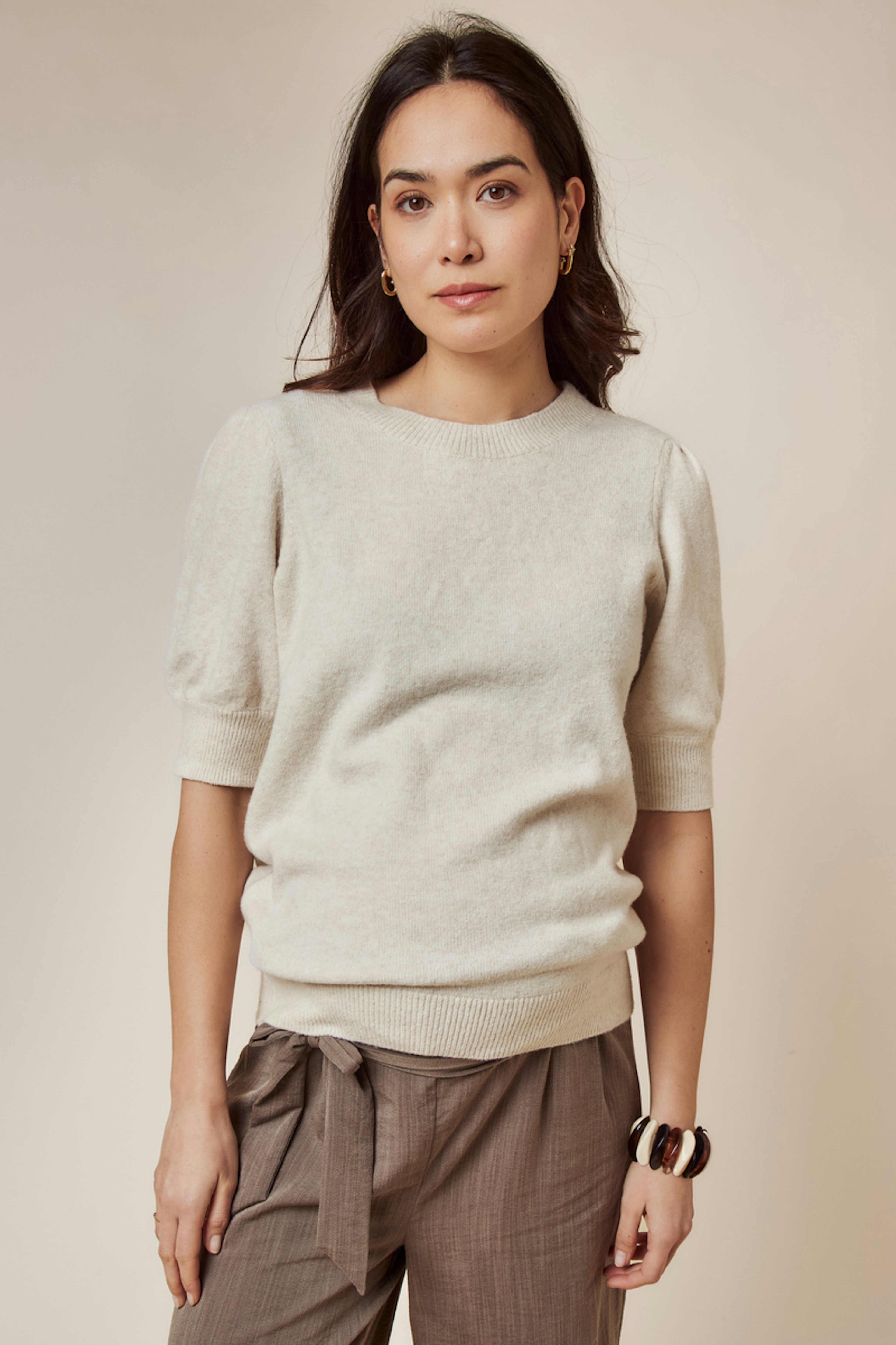 Pour un look chic et cosy, associez ce pull avec un pantalon en laine et des bottines camel. Idéal pour l'hiver ! • Pull en maille douce • Manches courtes • Coupe droite flatteuse • Col rond • Finitions côtelées