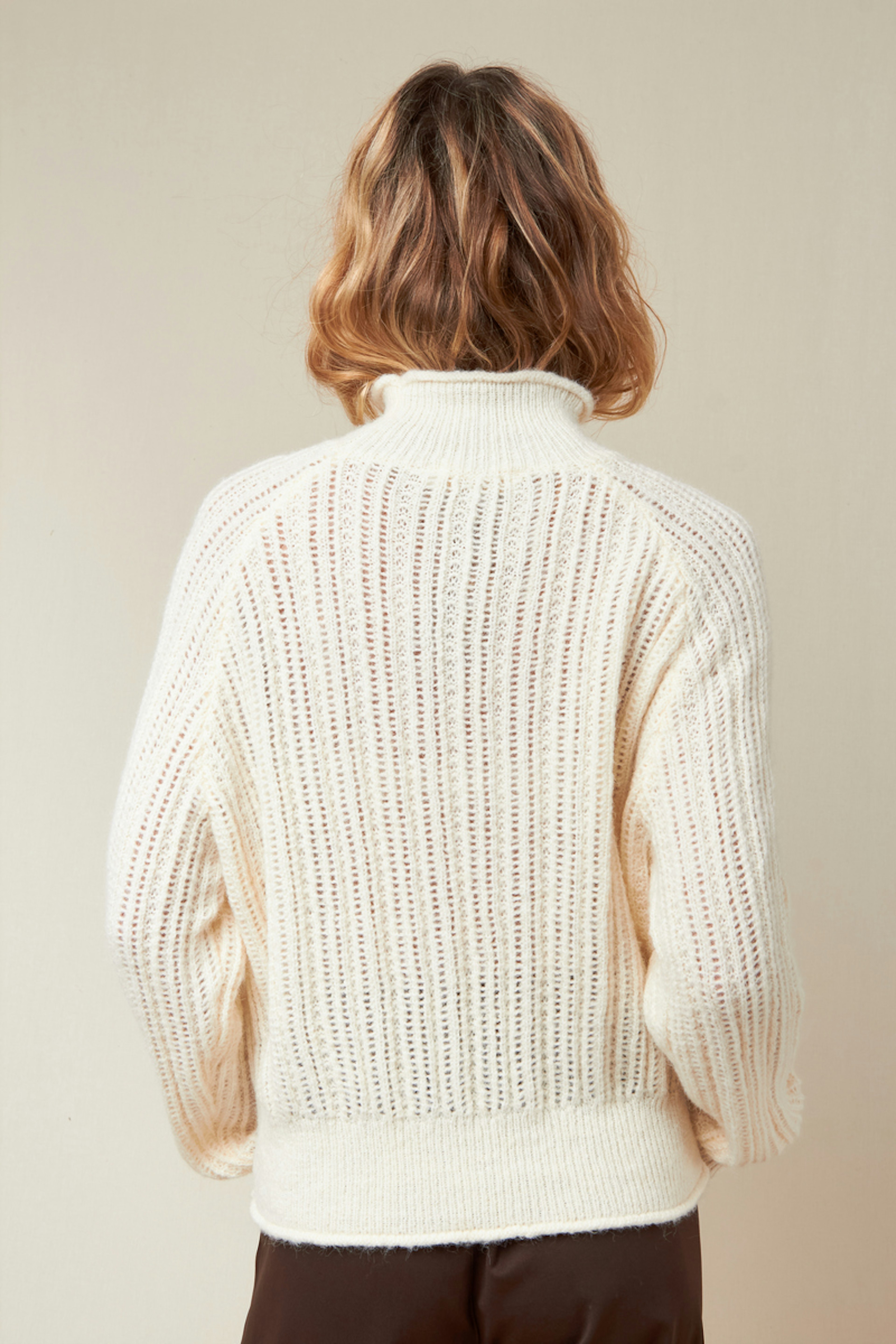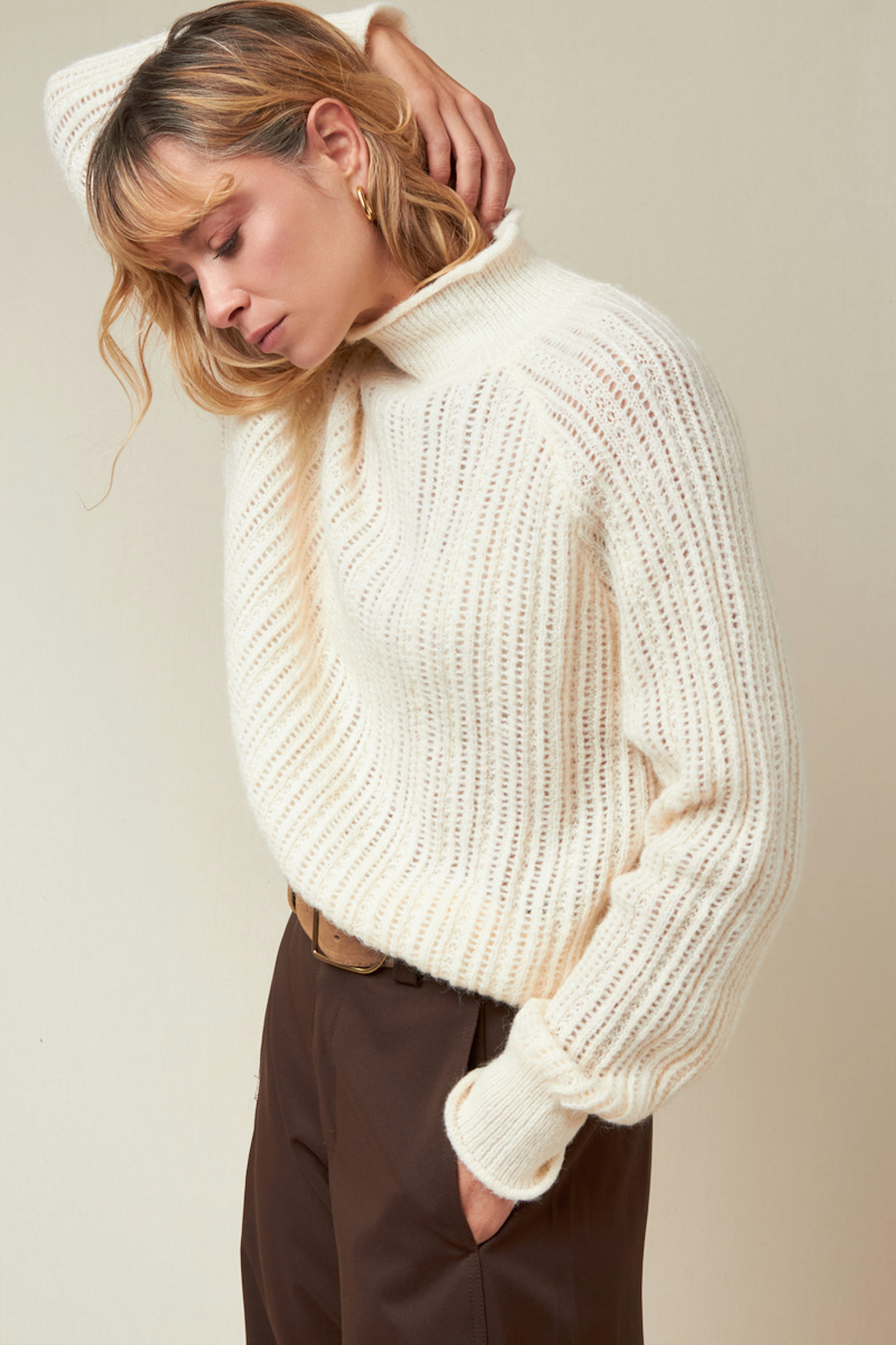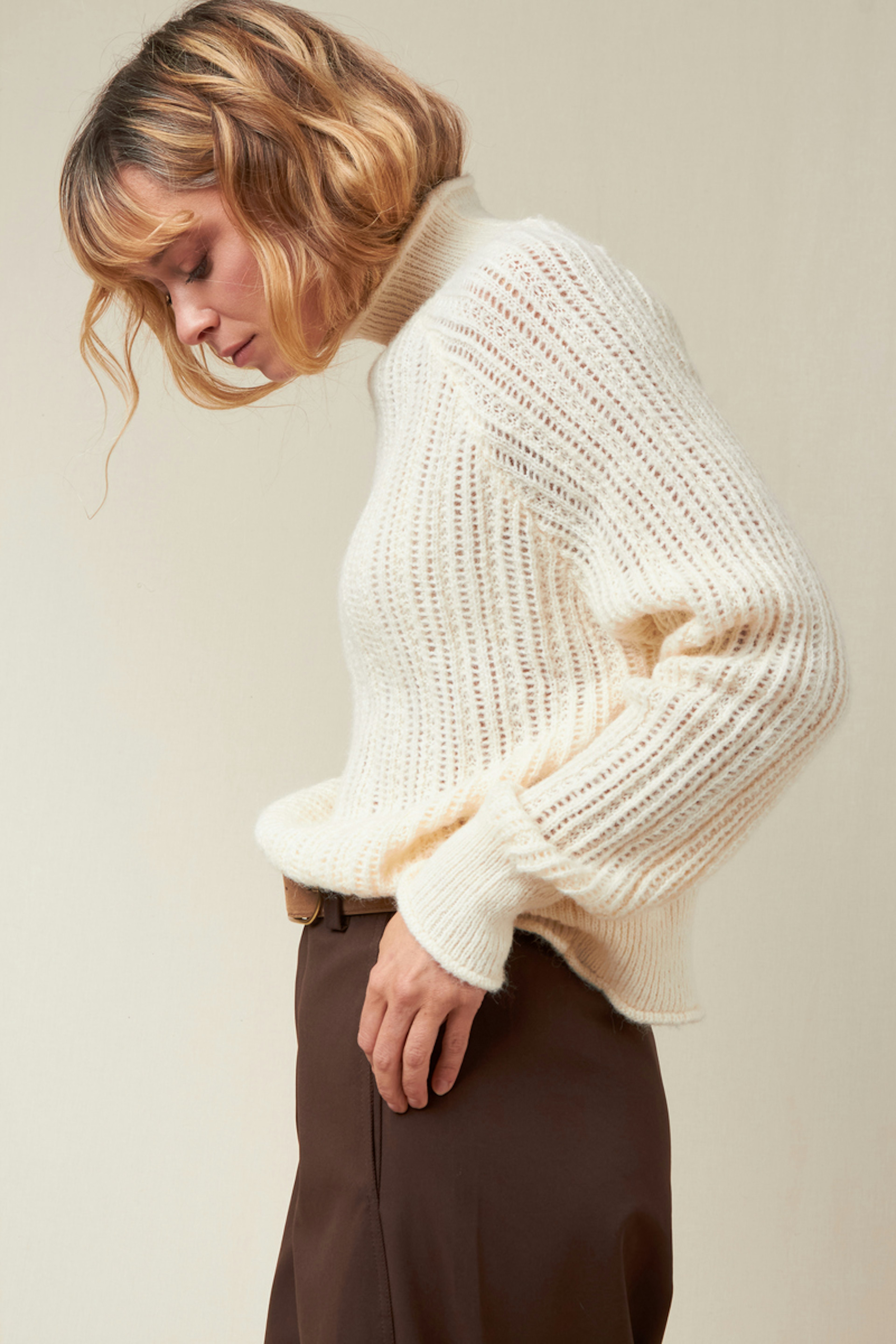 Assorti à votre jean flare préféré ou jupe midi chic, ce pull est un compagnon d'hiver parfait. Il vous enveloppe de confort et de style. • Pull en laine • Coupe ample • Col montant • Manches longues • Mailles ajourées