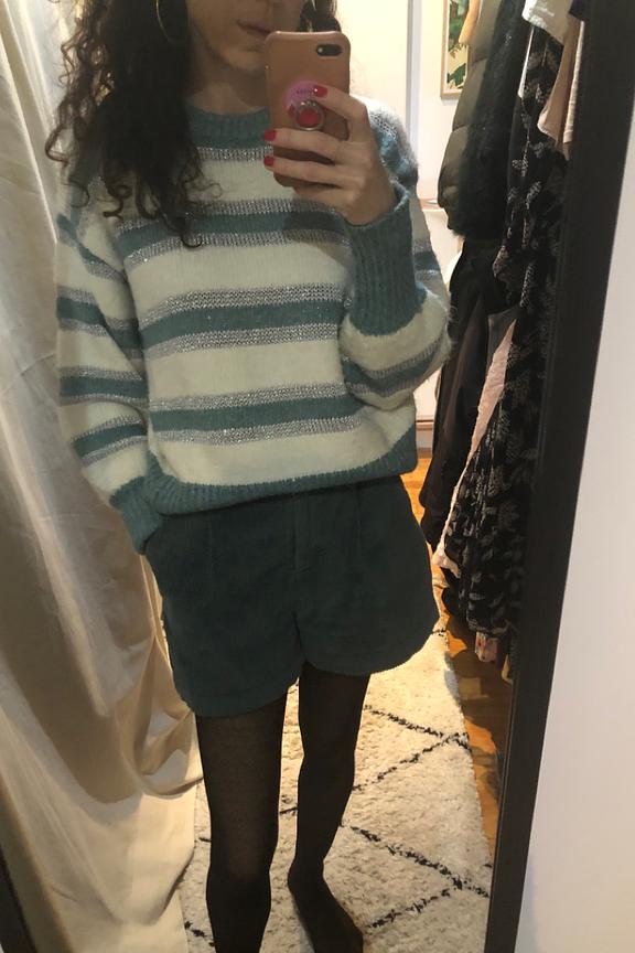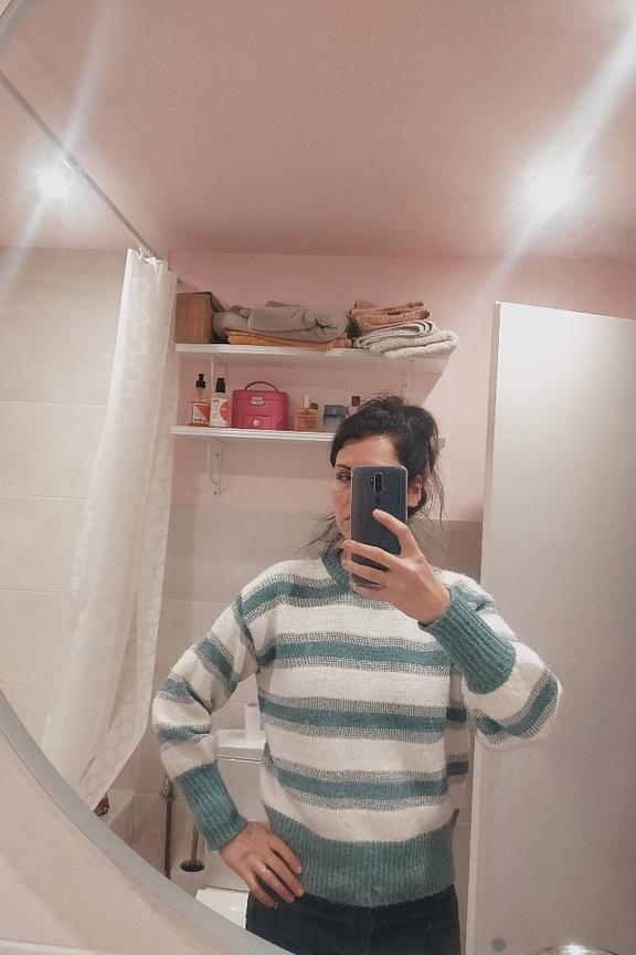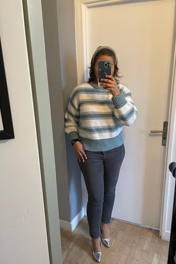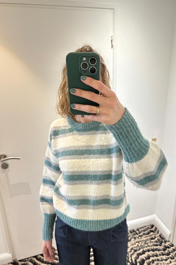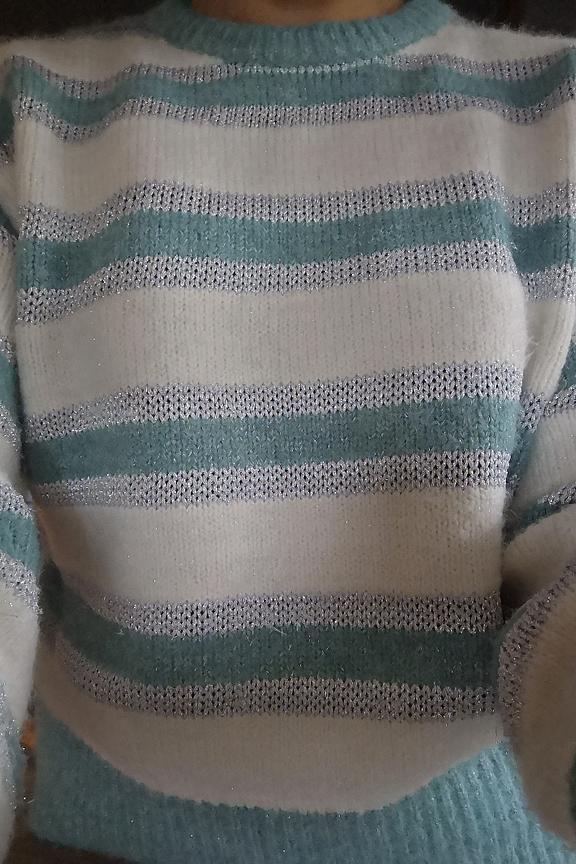 โข Pull en maille mohair et laine mรฉlangรฉs ร rayure blanc/bleu et argentรฉ โข Encolure ronde โข Coupe ample โข Volume en manche โข Finitions bord-cรดtes โข Longueur depuis l'รฉpaule 56 cm (pour un S/36)