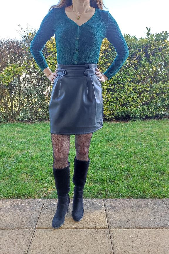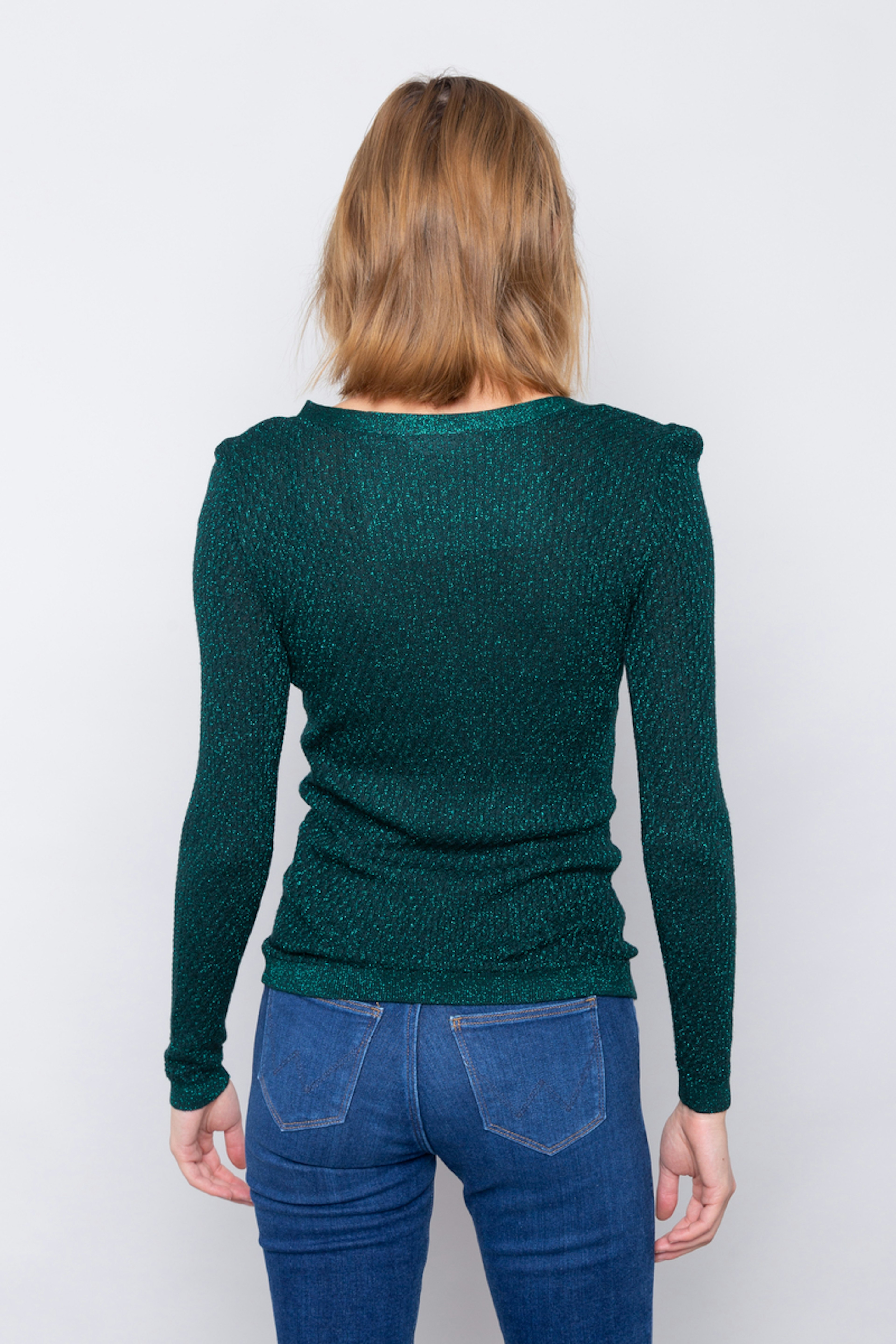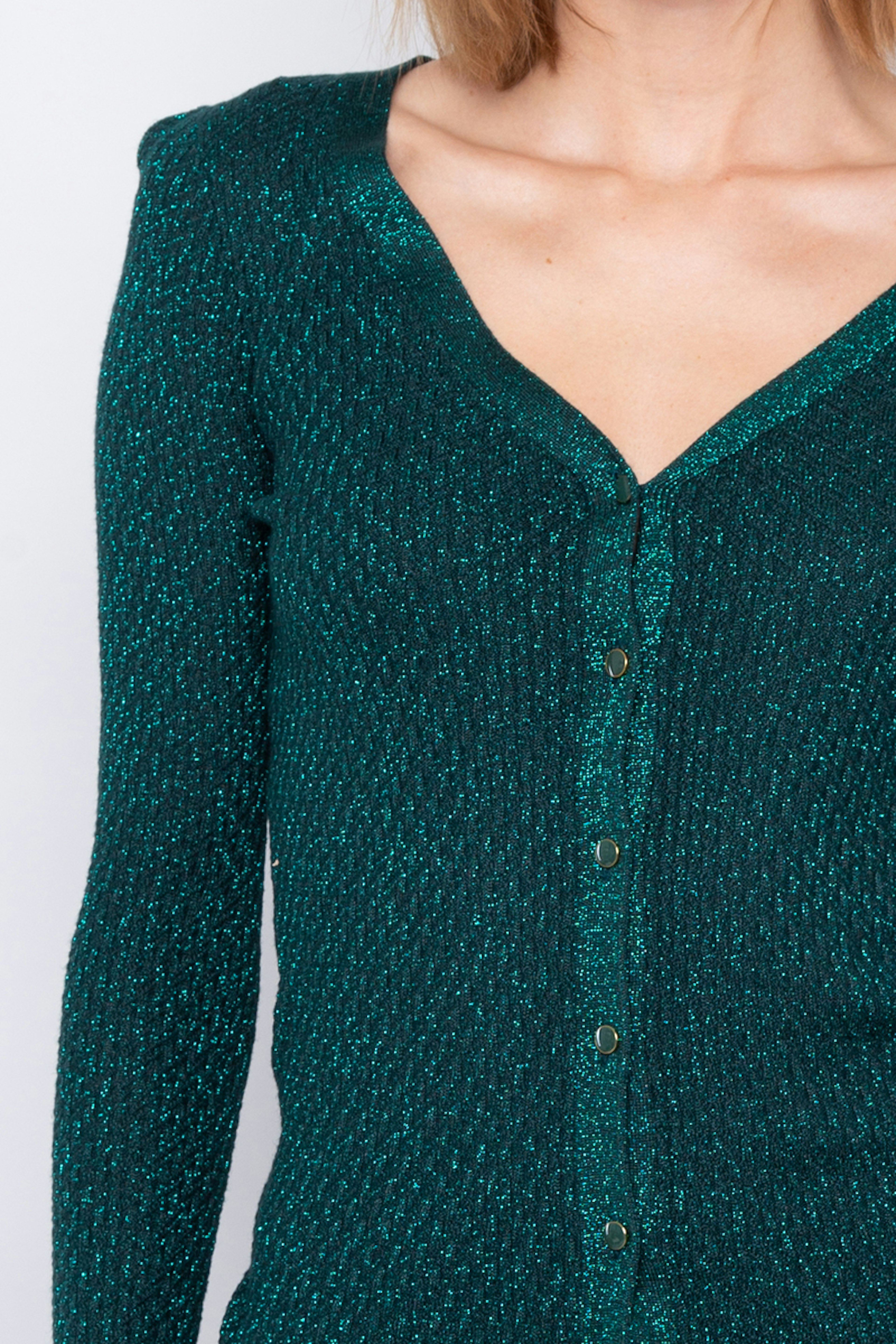 โข Cardigan ร manches longues en maille fantaisie โข Maille verte avec dรฉtails de lurex dorรฉ โข Idรฉal pour la mi-saison