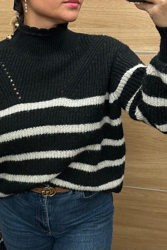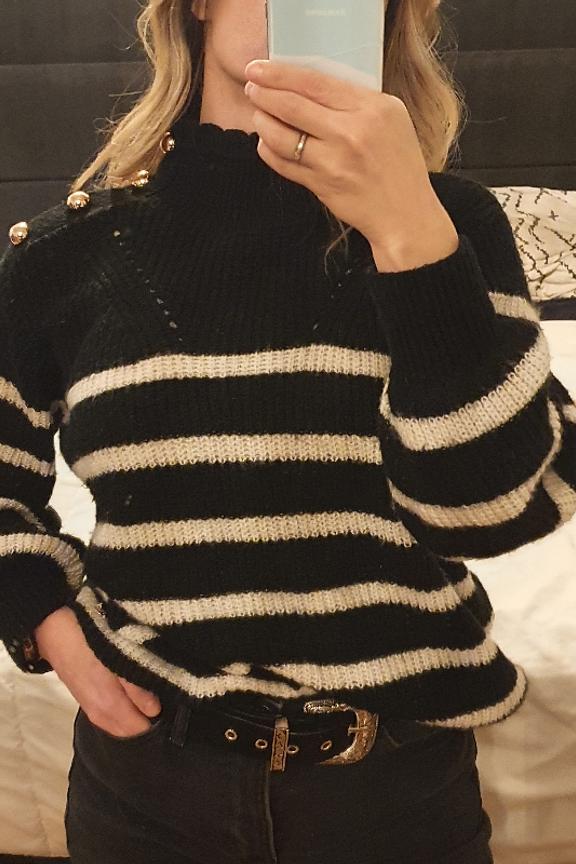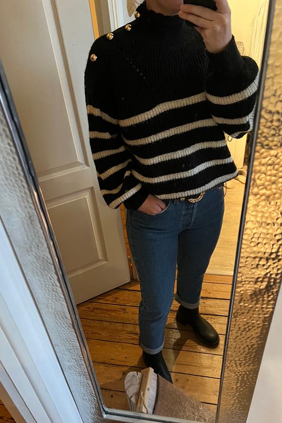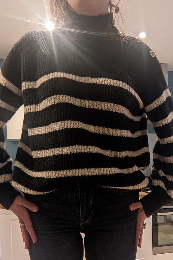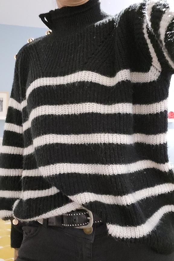 โข Pull rayรฉ faรงon mariniรจre โข Col avec finitions festonnรฉes โข Emmanchures basses โข Boutonnage dorรฉ sur l'รฉpaule gauche โข Dรฉtail bandes ajourรฉes sur le devant โข Pastille dorรฉe et gravรฉe LPE en bas de vรชtement โข Finitions bords-cรดtes