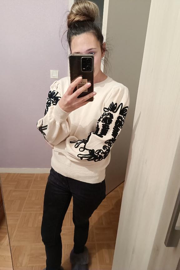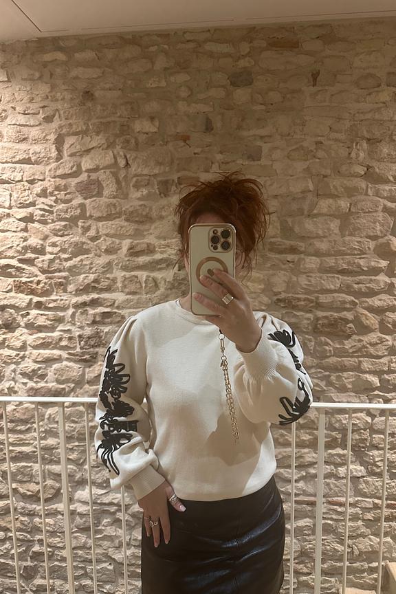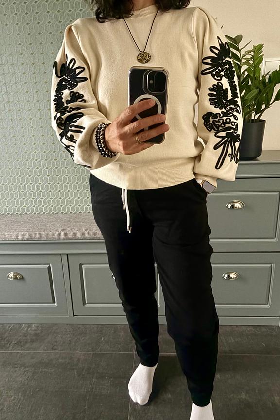 Pour un look audacieux, associez ce pull à un pantalon en cuir et des bottines. Parfait en toute saison. • Pull avec détails en broderie • Manches bouffantes élégantes • Coupe droite classique • Col rond intemporel • Motif floral sophistiqué