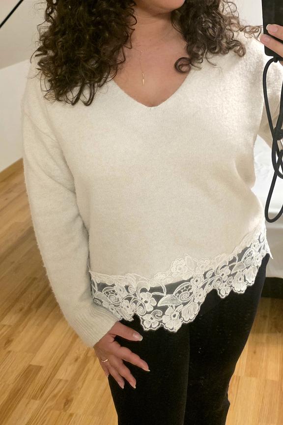 Pour un style cosy, associez-le à un jean skinny brut et des bottines en cuir. Idéal pour l'hiver. • Pull avec détail dentelle • Col en V • Manches longues • Ourlet festonné • Motif floral