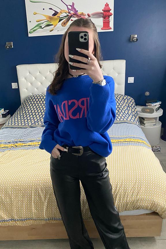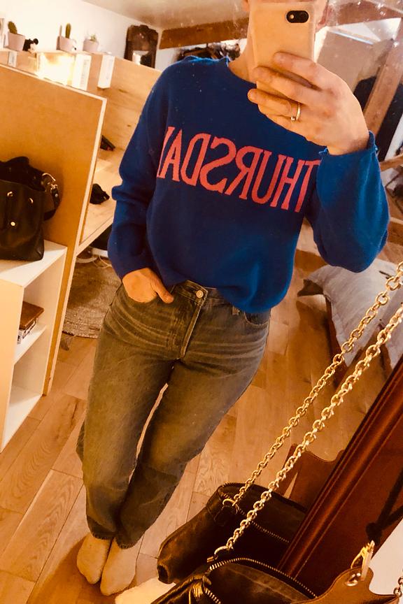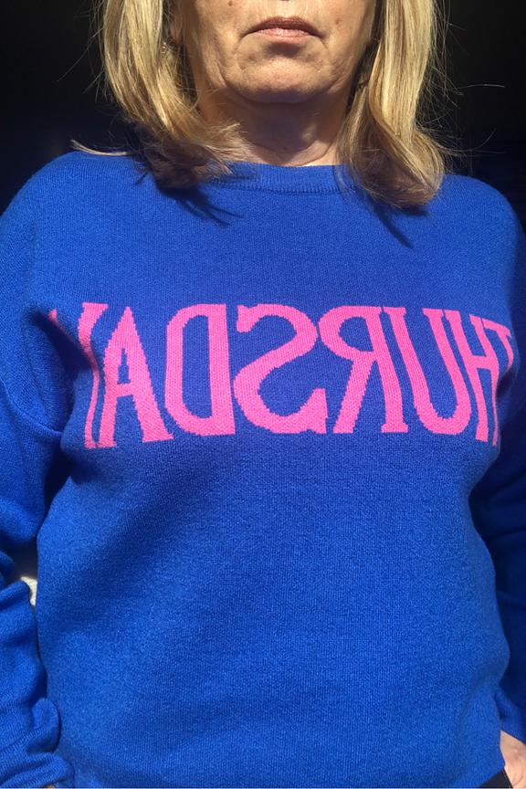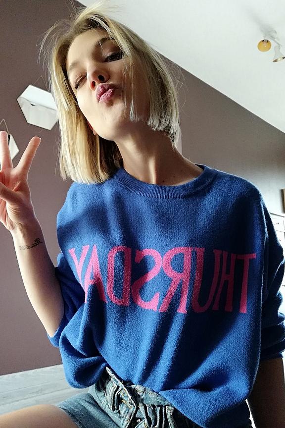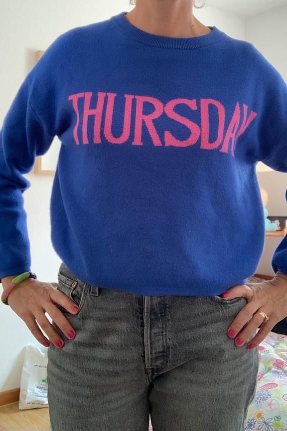 Faites chaque jour de la semaine un dรฉfilรฉ de mode avec ce pull bleu vibrant! Parfait pour l'automne, ร  marier avec un jean et des baskets blanches pour un look dรฉcontractรฉ chic. โ€ข Pull court en viscose mรฉlangรฉe โ€ข Coupe dรฉcontractรฉe โ€ข Inscription colorรฉe "THURSDAY"