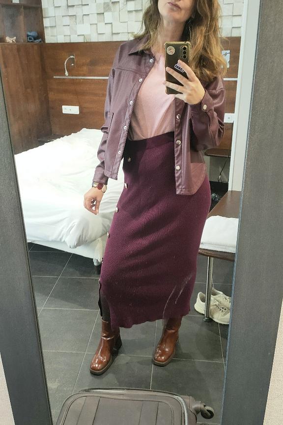 “J’adore la couleur et se porte avec tout. Par contre la qualité est moyenne, le tissu se détend un peu au fil de la journée”