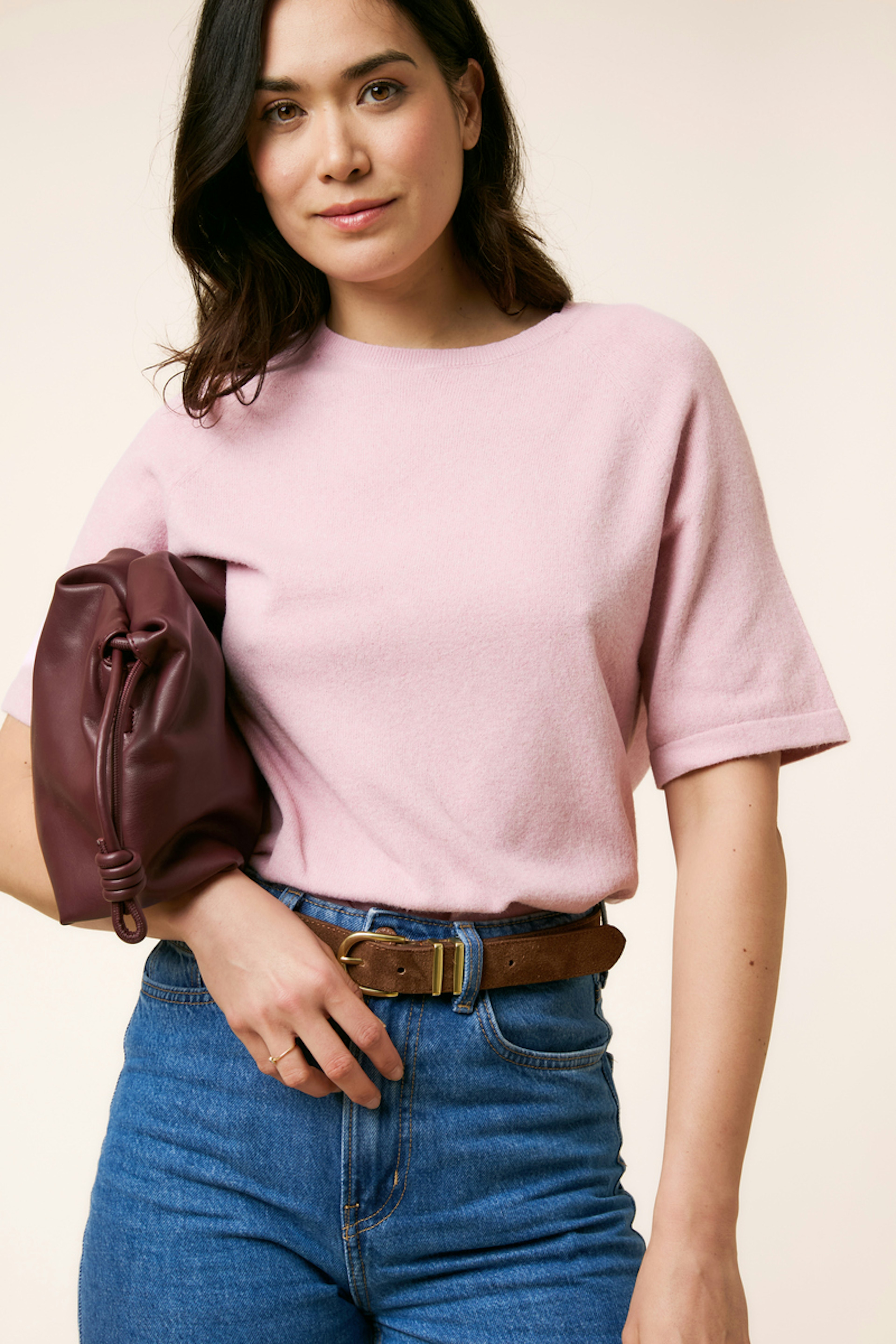 Portez ce pull rose avec un jean taille haute et des bottines en cuir pour un style chic et décontracté. Parfait pour toutes les saisons ! • Pull à manches courtes • Coupe droite flatteuse • Col rond classique • Doux et confortable • Couleur rose élégante