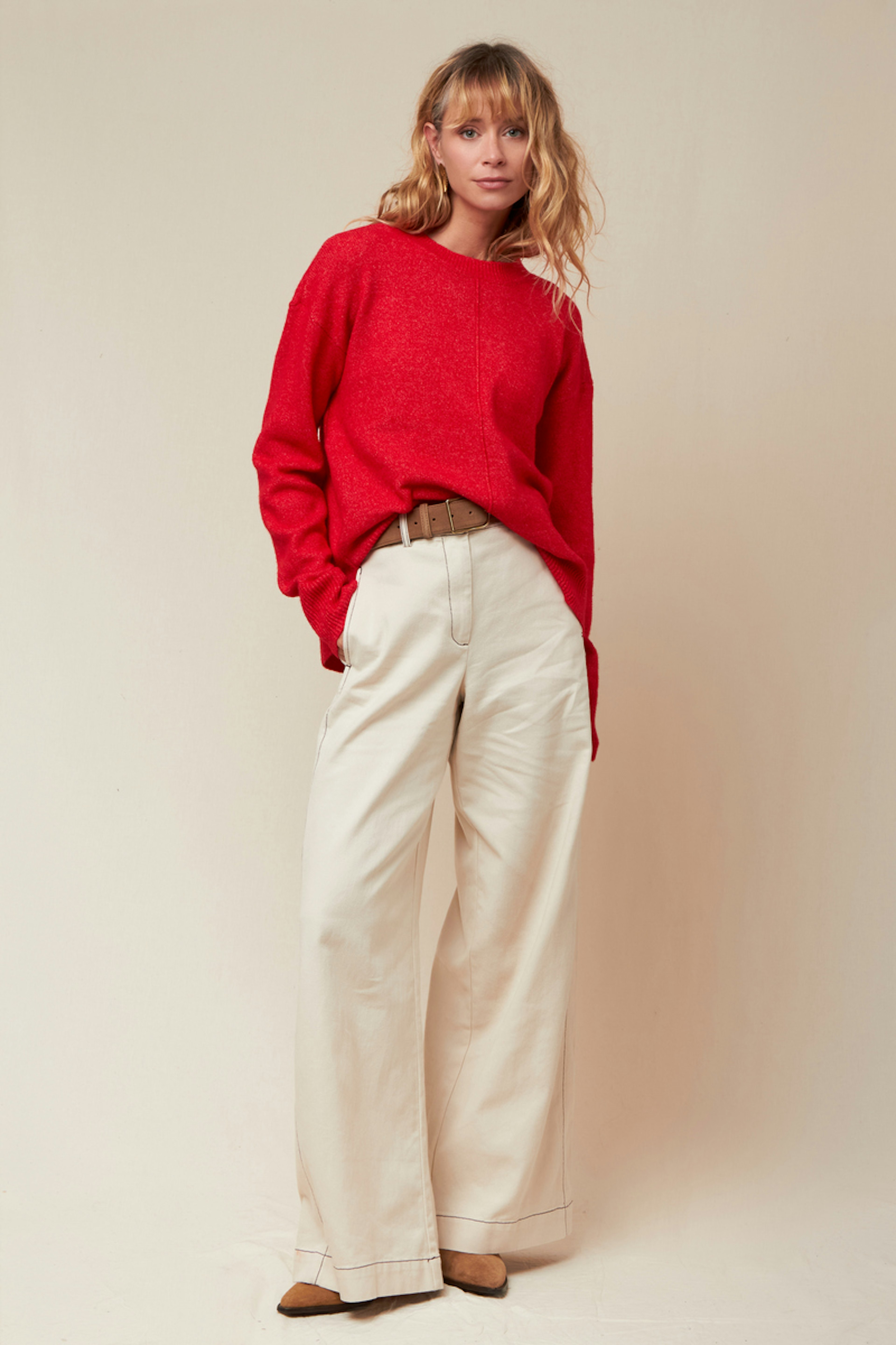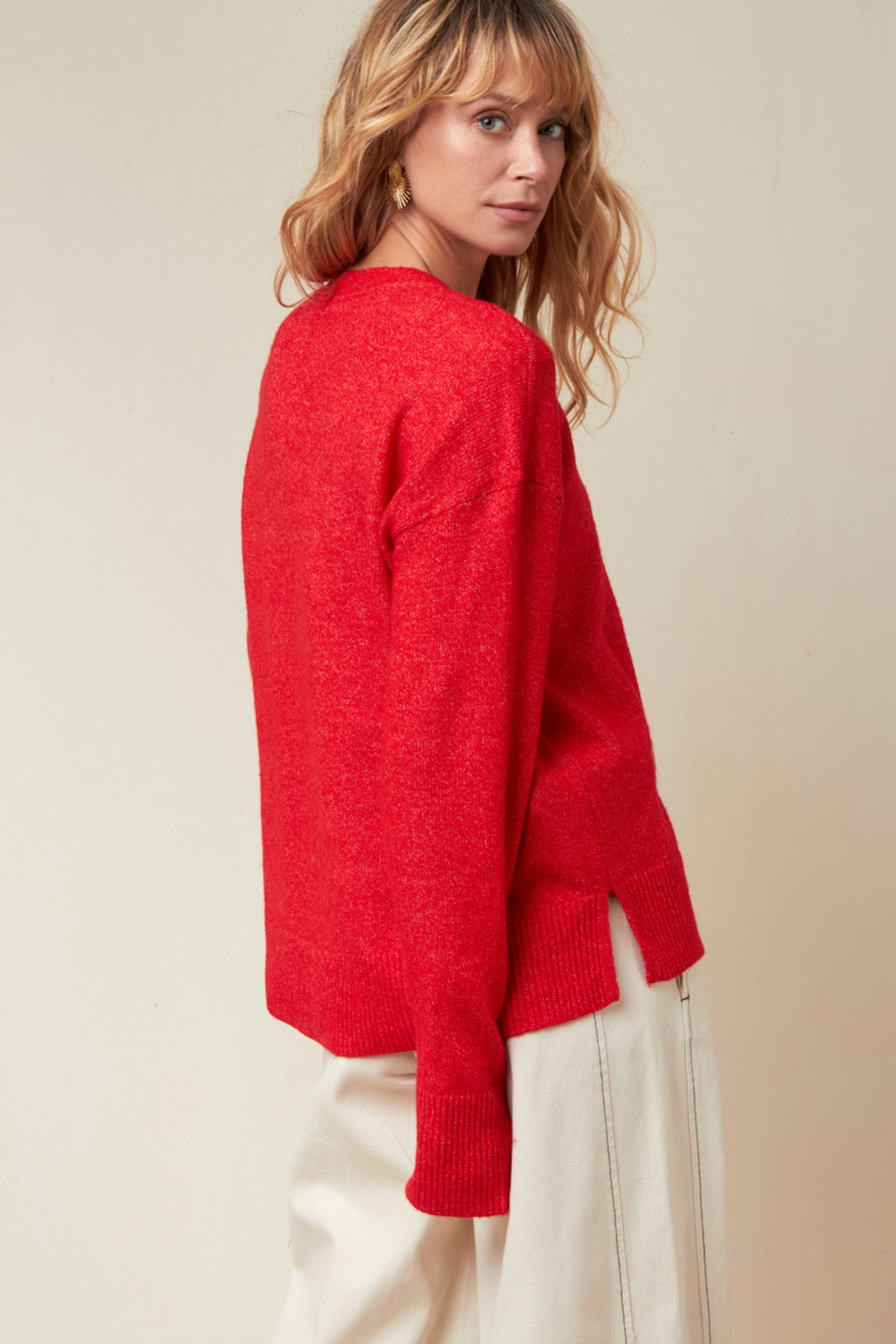 Optez pour un look chic et cosy en combinant ce pull rouge avec un jean noir ajusté et des bottines en cuir pour un style hivernal parfait. • Pull ample texturé • Coupe décontractée • Manches longues • Encolure ronde • Finitions côtelées