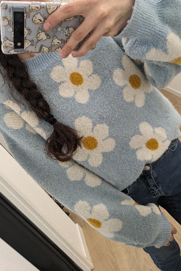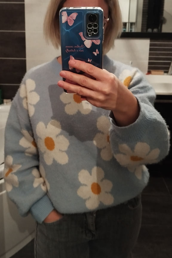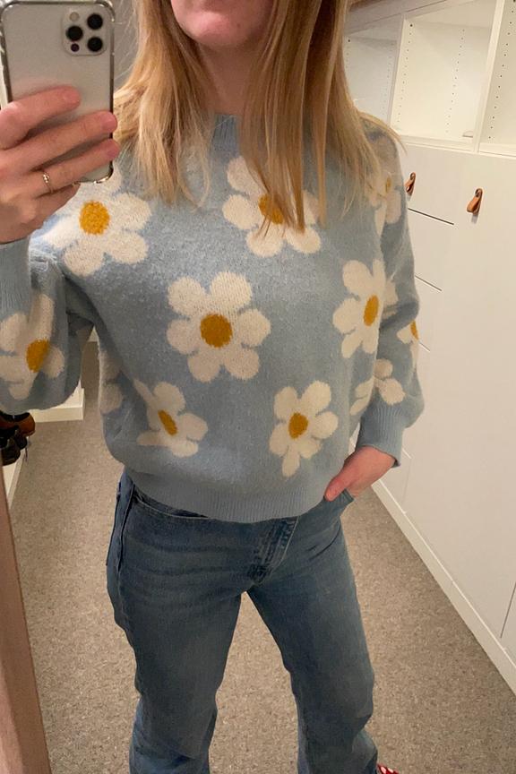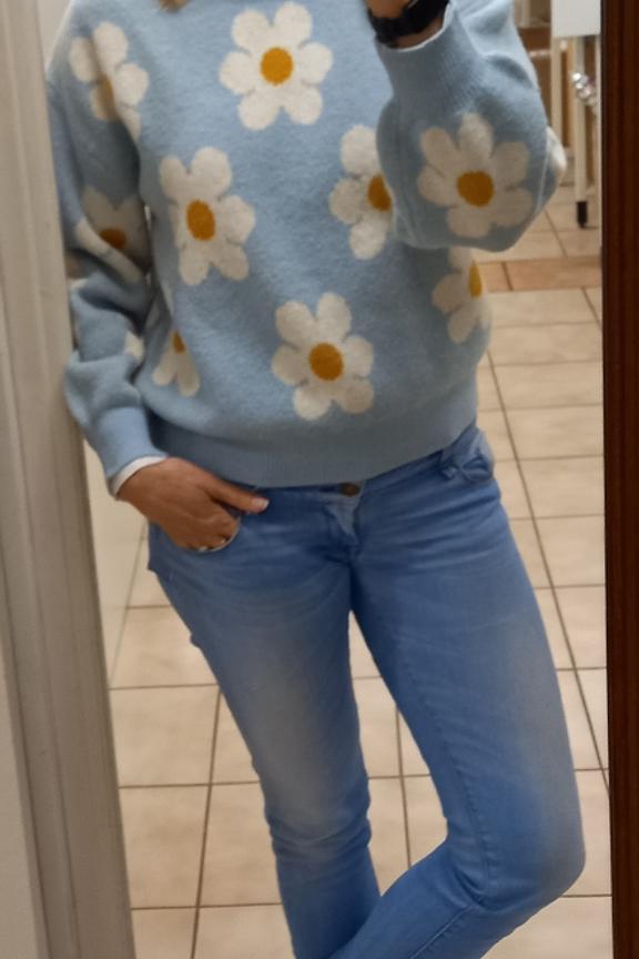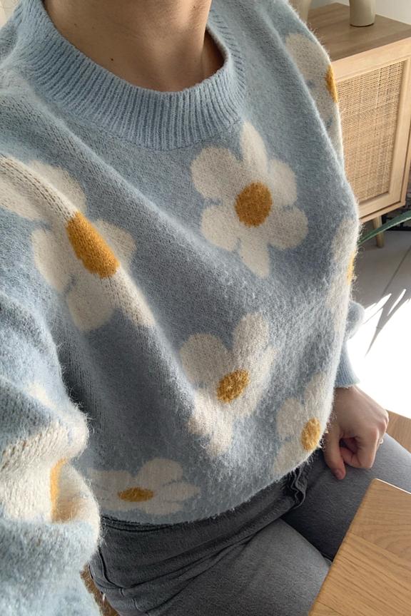 โข Pull bleu clair avec motifs ร fleurs blanches โข Col rond โข Manches longues โข Poignets cรดtelรฉs โข Contient 18% de mohair