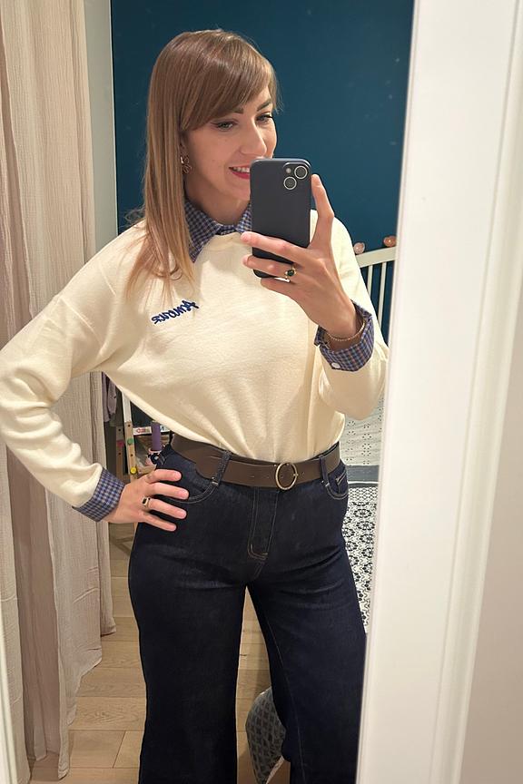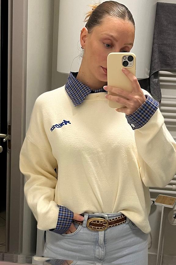 Associez ce pull avec un jean foncé et des bottines pour une allure chic en hiver. • Pull beige • Col chemise intégré • Manches longues • Détail imprimé "Amour" • Poignets à motifs à carreaux