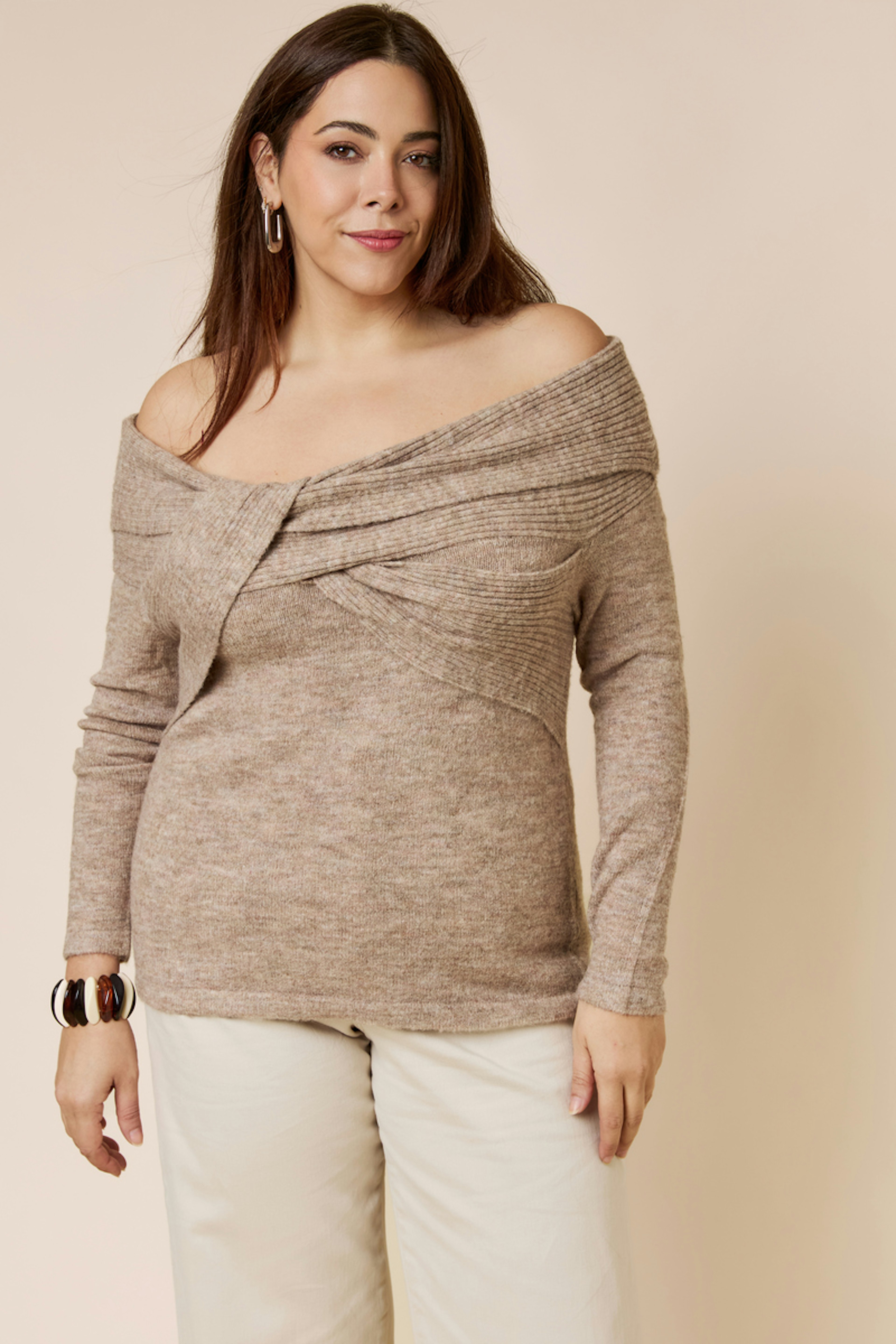 Associez ce sublime pull à une jupe moulante taille haute et des bottines pour un look chic hivernal. • Pull en maille douce • Épaules dénudées • Manches longues • Détail croisé à l'avant • Coloris beige élégant