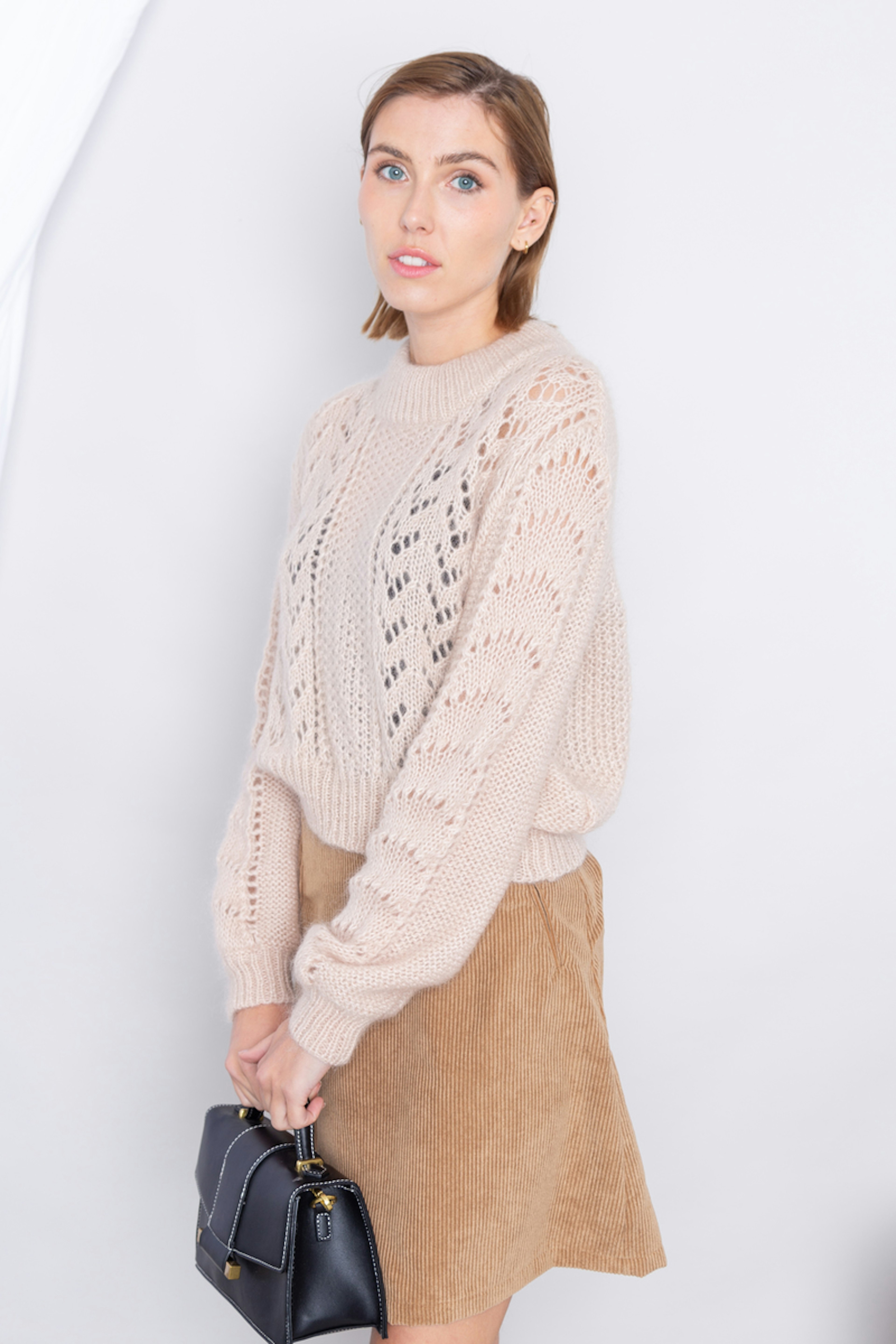 โข Pull tricotรฉe en maille ajourรฉe โข Col rond avec bord-cรดte large โข Bord-cรดte aux poignets et sur le bas โข Volume cocooning